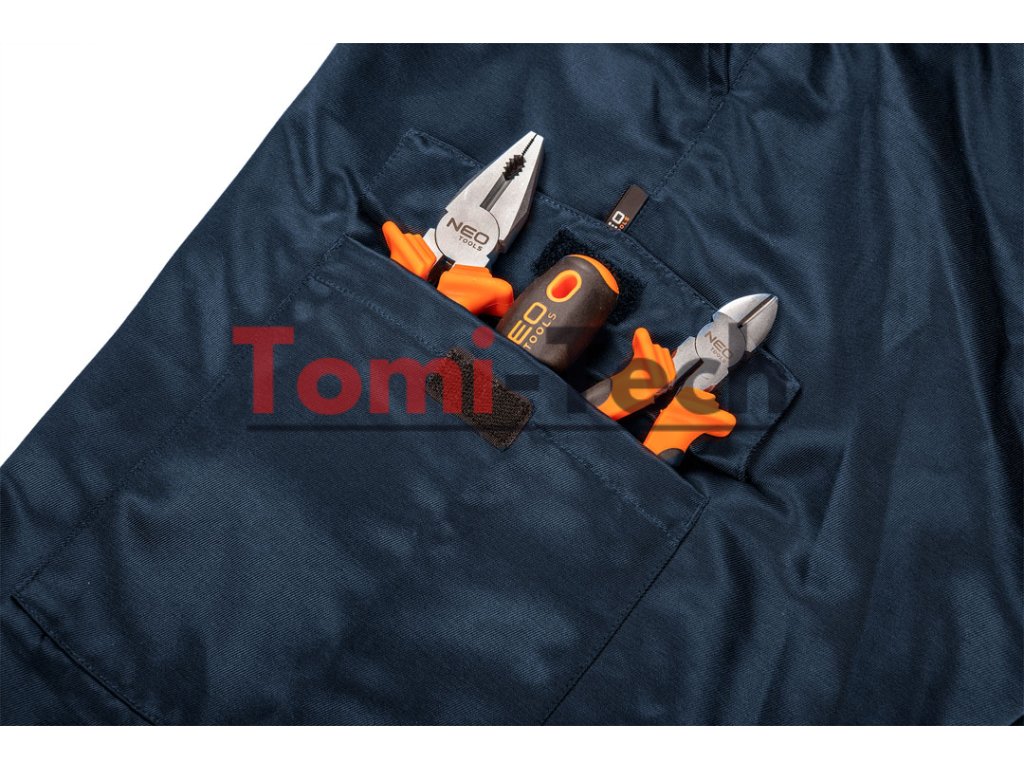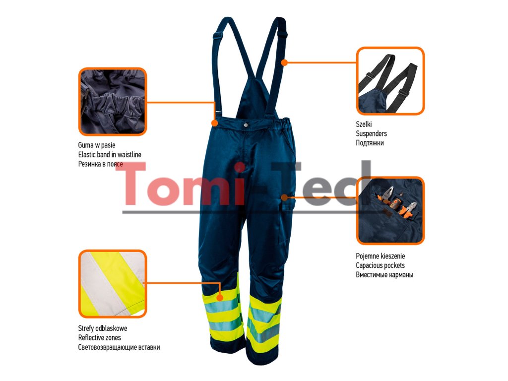 Pracovné montérky s vysokou viditeľnosťou, tmavomodré, veľkosť XXL, trieda 1 podľa EN ISO 20471, 80 % polyester, 20 % bavlna, gramáž 245 g/m2, multifunkčné vrecká, elastické traky, elastický pás, certifikát CE, EN ISO 13688:2013Dodatočné parametre