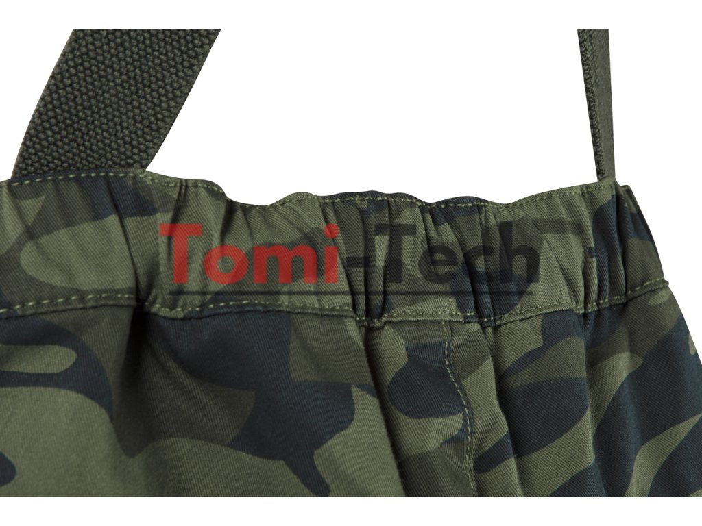 Pracovné montérky s maskáčovým vzorom, veľkosť XXXL, 60 % bavlna, 40 % polyester, 255 g/m2, multifunkčné vrecká, vrecká na suchý zips, vrecko na preukaz totožnosti, vrecko na pero, elastický pás, elastické traky, vložka na preukaz totožnosti, jedinečný maskáčový vzor, certifikácia CEDodatočné parametre