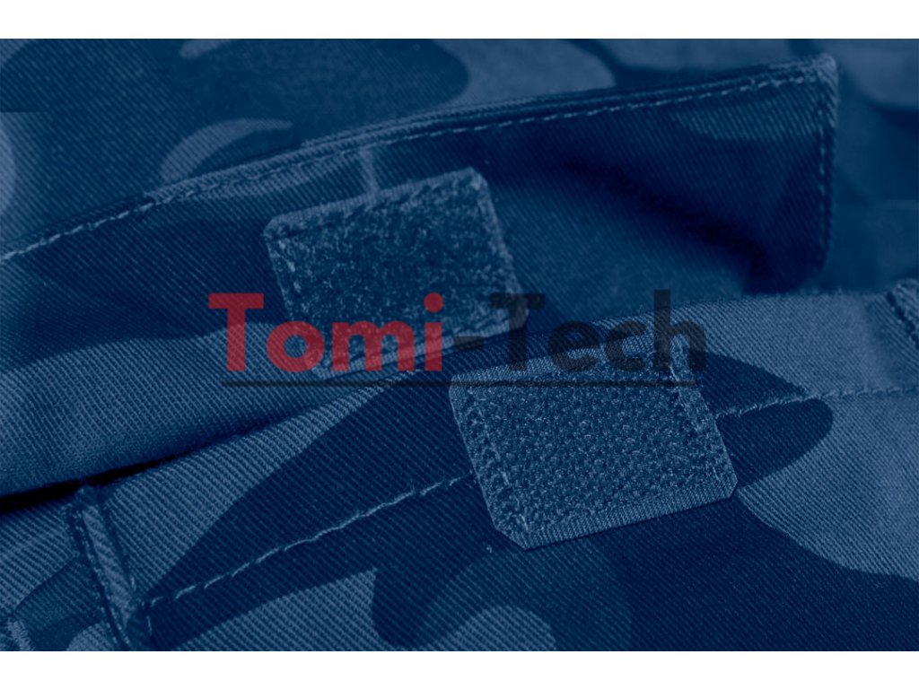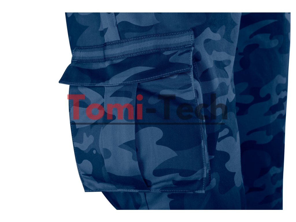Pracovné montérky CAMO Navy, zloženie: 60 % bavlna, 37 % polyester, 3 % elastan, jedinečný vzor v odtieňoch modrej, multifunkčné vrecká, vrecko na preukaz, vrecko na pero, elastický pás, elastické traky z gumy, vložka na preukaz, veľkosť XSDodatočné parametre