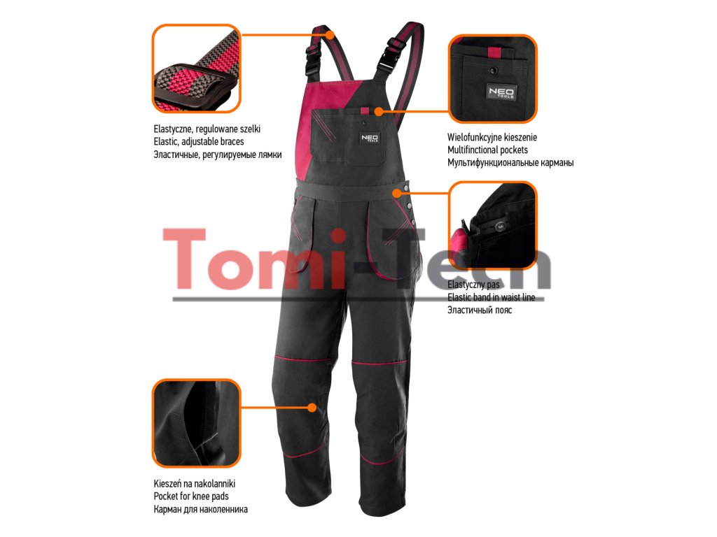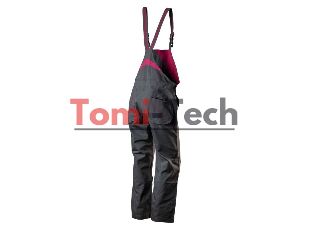 Dámske pracovné montérky, veľkosť L, 65 % bavlna, 35 % polyester, 245 g/m2, spevnené kolená s vreckami na chrániče kolien, elastický pás, elastické traky, multifunkčné vrecká, módne farby, certifikát CE, EN ISO 13688:2013Dodatočné parametre