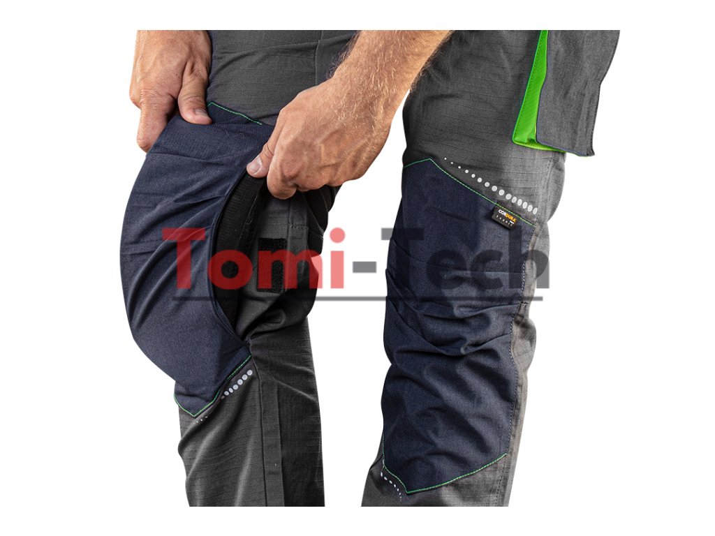 PRÉMIOVÉ pracovné montérky, 100 % bavlna, ripstopová tkanina, gramáž 210 g/m2, výstuhy z Cordury, držiak na identifikačný odznak - možno uložiť do vrecka, vysoké sedlo v chrbte, vrecko na chrániče kolien, elastický panel z Cordury Stretch v rozkroku pre väčšie pohodlie, výstuhy kolien z Cordury, reflexné potlače na nohaviciach a sedle, elastické traky, elastický pás, tvarované kolená, vnútorná menovka, jedinečný vlastný dizajn, certifikát CE, veľkosť XXLDodatočné parametre