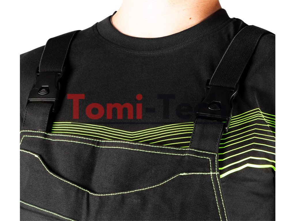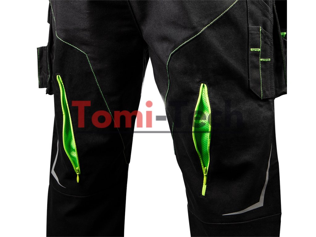 Pracovné montérky PREMIUM PRO, čierne s neónovo zeleným prešívaním, zloženie hlavného materiálu: 100 % bavlna, plátno s gramážou 425 g/m2, zloženie materiálu výstuh: 75 % bavlna, 25 % nylon, Cordura NYCO s gramážou 272 g/m2, 14 multifunkčných vreciek so zipsom alebo magnetickým zapínaním, vrecká na chrániče kolien, dvojito profilované kolená, výstuhy z Cordury NYCO na vreckách, kolenách a nohaviciach, trojité švy na nohaviciach, predĺženie dĺžky nohavíc o 4 cm, vetranie na zadnej strane nohavíc, gumené traky s protišmykovou potlačou, zipsy YKK, reflexné prvky 3M, vnútorná menovka, jedinečný vlastný dizajn, certifikát CE, veľkosť LDodatočné parametre