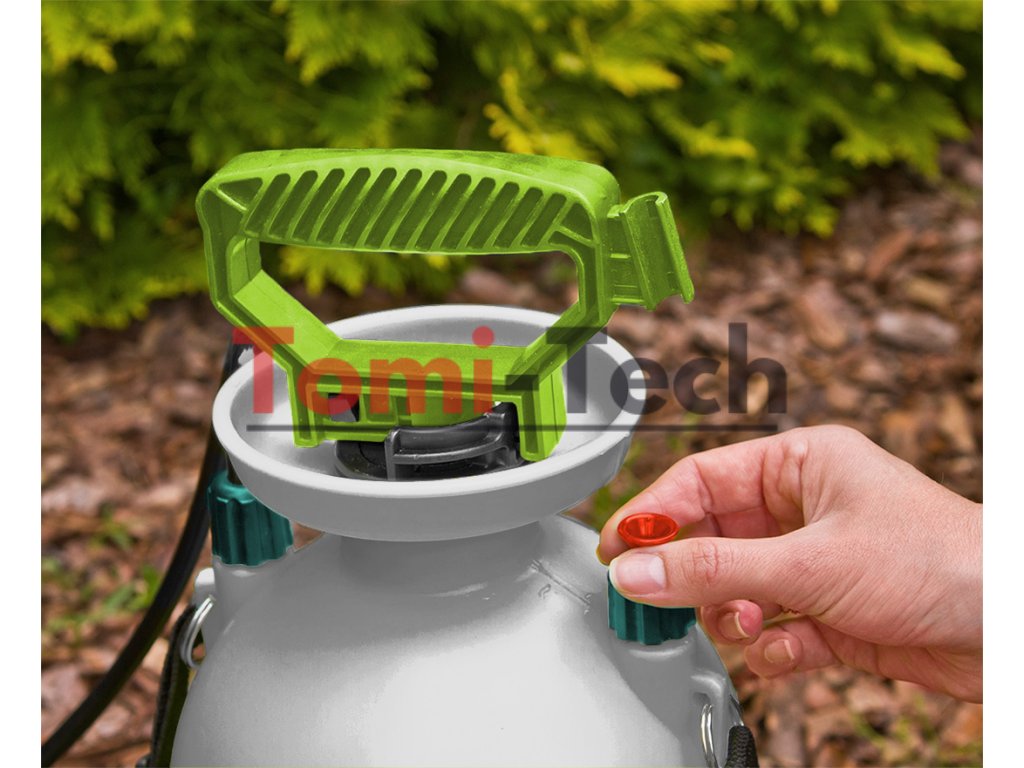 5 l tlakový postrekovač, pracovný tlak 2,5 – 3 bary, použiteľný pri teplotách 0 – 45 °C