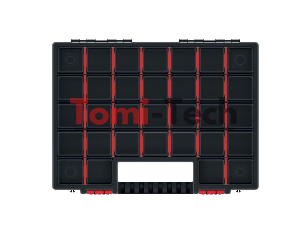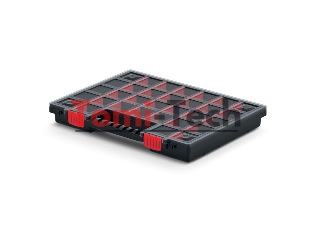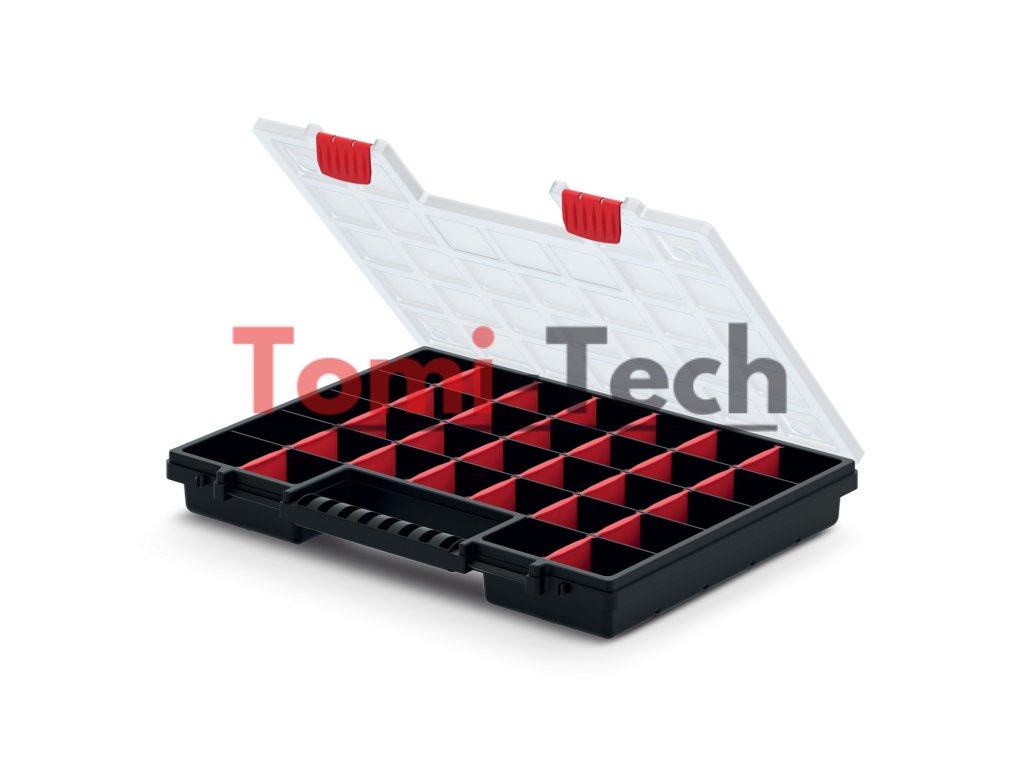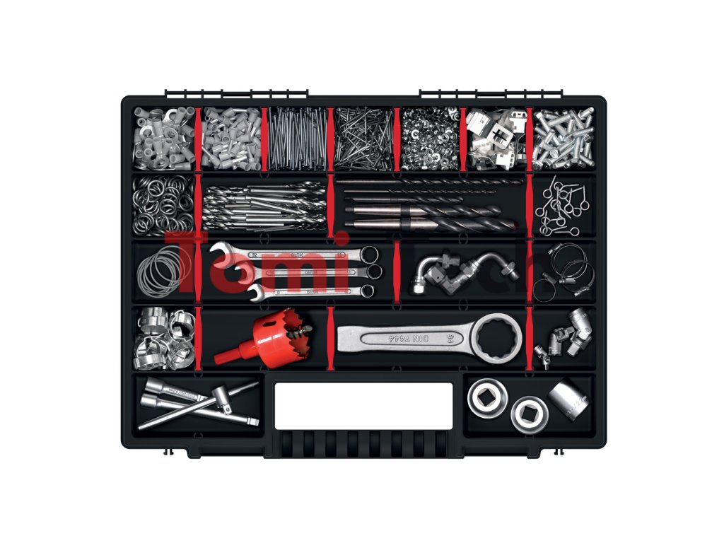 Organizér na náradie KISTENBERG NORS 40 KNO40305S. Určený na prenášanie a organizovanie malých predmetov. Vybavený ergonomickou rukoväťou a odolnými upevňovacími prvkami. 26 odnímateľných priehradiek uľahčuje prispôsobenie priestoru uloženým predmetom. Priehľadný kryt z PP Random, odolné telo z polymérovej zmesi.