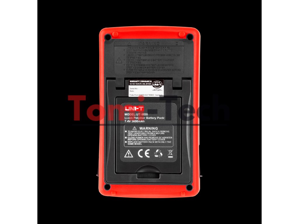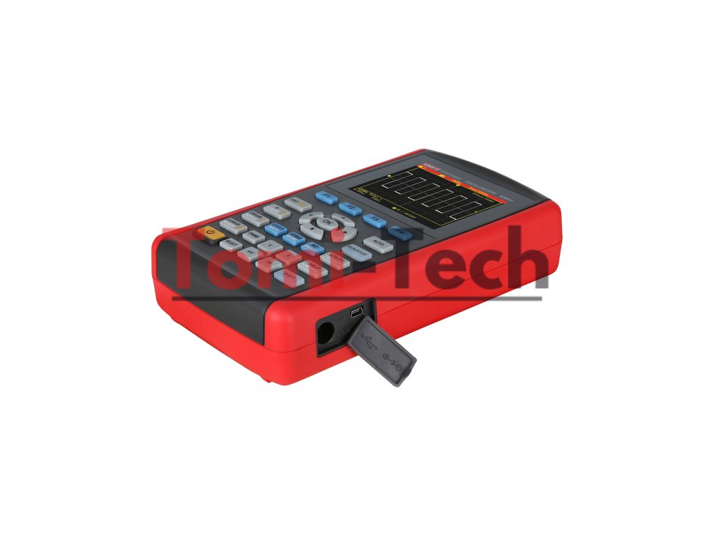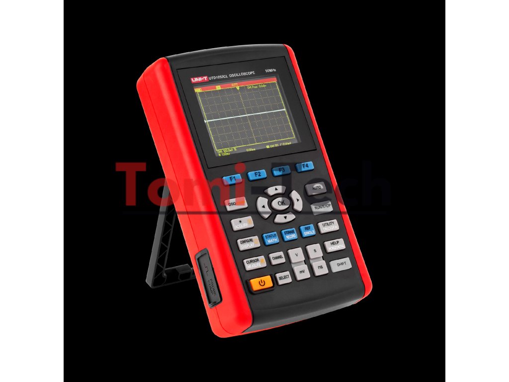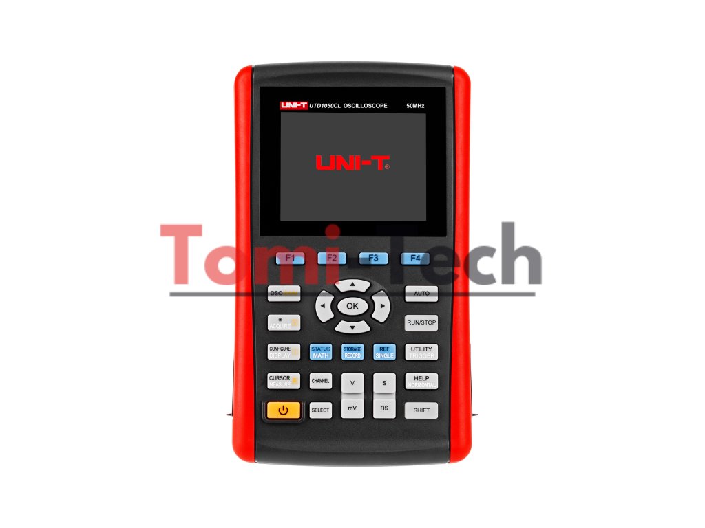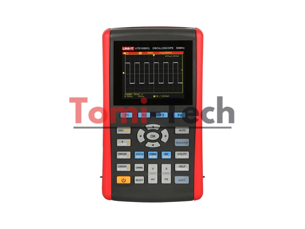 UTD1050CL je vybavený 3,5-palcovým TFT LCD displejom s rozlíšením 320x240 px, ktorý zaisťuje jasný obraz a jednoduché ovládanie. Zariadenie je napájané lítium-iónovou batériou s kapacitou 3600 mAh, čo umožňuje dlhodobú prevádzku v teréne bez nutnosti neustáleho nabíjania. Vďaka kompaktným rozmerom a nízkej hmotnosti (0,9 kg) sa osciloskop ľahko prenáša a používa na rôznych pracoviskách.