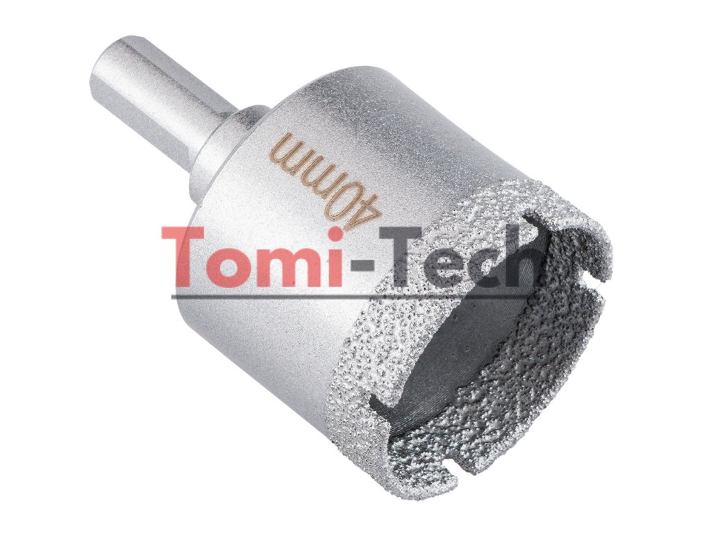 Diamantová dierová píla 40 mm, spájkované diamantové zrno, valcová stopka, použitie: na kameninu, keramiku, sklo, tehly, mokrá/suchá prevádzka, vŕtanie bez príklepu, maximálne otáčky 3000 ot./min, maximálna hĺbka vŕtania: 30 mmDodatočné parametre