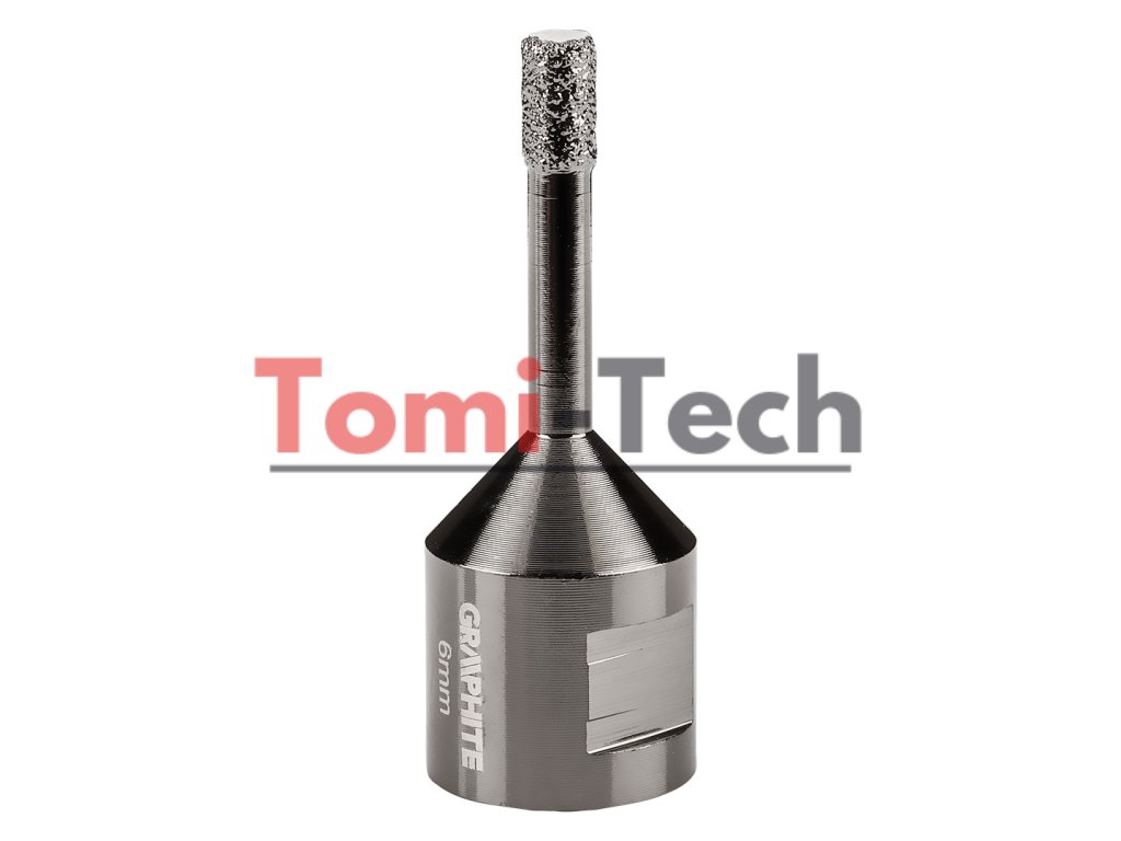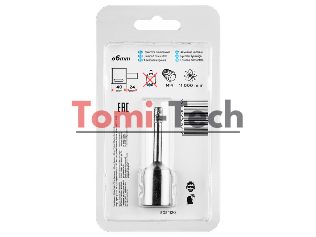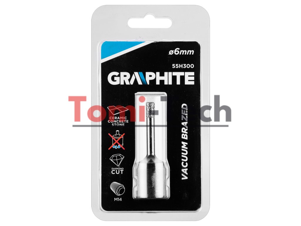 Diamantová dierová píla, priemer 6 mm, pracovná dĺžka 40 mm, celková dĺžka 60 mm, závit M14, vákuovo spájkovaná, na suché použitie, plnená parafínom, 11000 ot./min.Dodatočné parametre