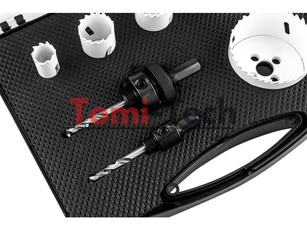 Bimetalové dierové píly 19 mm, 29 mm, 33 mm, 51 mm, 68 mm, adaptér 3/8 a 7/16 Hex, použitie: kov, oceľ/nerezová oceľ, liatina, mosadz, hliník, drevo, 19 a 29 mm: závit: 1/2'' x 20 UNF, 33, 51 a 68 mm: závit 5/8'' x 18 UNF, hĺbka vŕtania: 38 mm, výška 51 mm pre priemery 19, 29, 33 mm, výška 44 mm pre priemery 51, 68 mm, vyrobené z rýchloreznej ocele HSS, sada 7 kusov, priemer 19 mm: max. otáčky: oceľ: 460 ot./min, nehrdzavejúca oceľ: 230 ot./min, hliník: 690 ot./min, drevo: 680 ot./min, liatina: 300 ot./min, mosadz: 600 ot./min, priemer 29 mm: max. rýchlosť otáčania: oceľ: 300 ot./min, nehrdzavejúca oceľ: 150 ot./min, hliník: 450 ot./min, drevo: 450 ot./min, liatina: 200 ot./min, mosadz: 400 ot./min, priemer 33 mm: max. rýchlosť otáčania: oceľ: 260 ot./min, nehrdzavejúca oceľ: 135 ot./min, hliník: 390 ot./min, drevo: 390 ot./min, liatina: 175 ot./min, mosadz: 345 ot./min, priemer 51 mm: max. rýchlosť otáčania: oceľ: 170 ot./min, nehrdzavejúca oceľ: 85 ot./min, hliník: 255 ot./min, drevo: 200 ot./min, liatina: 115 ot./min, mosadz: 230 ot./min, priemer 68 mm: max. rýchlosť otáčania: oceľ: 130 ot./min, nehrdzavejúca oceľ: 65 ot./min, hliník: 190 ot./min, drevo: 165 ot./min, liatina: 85 ot./min, mosadz: 165 ot./minDodatočné parametre