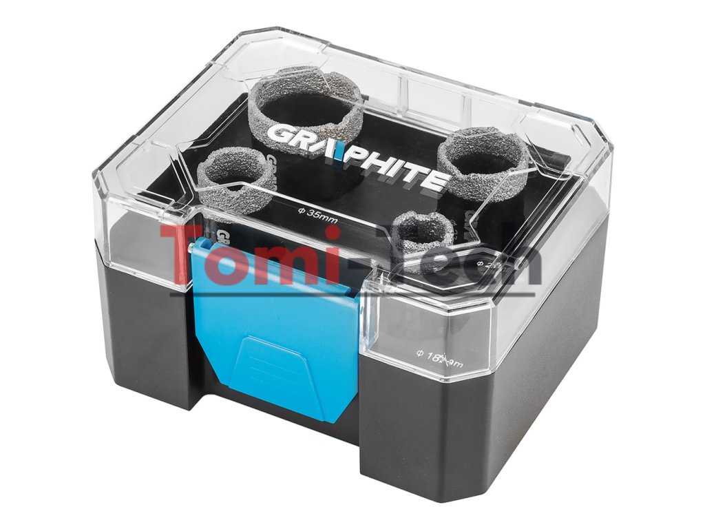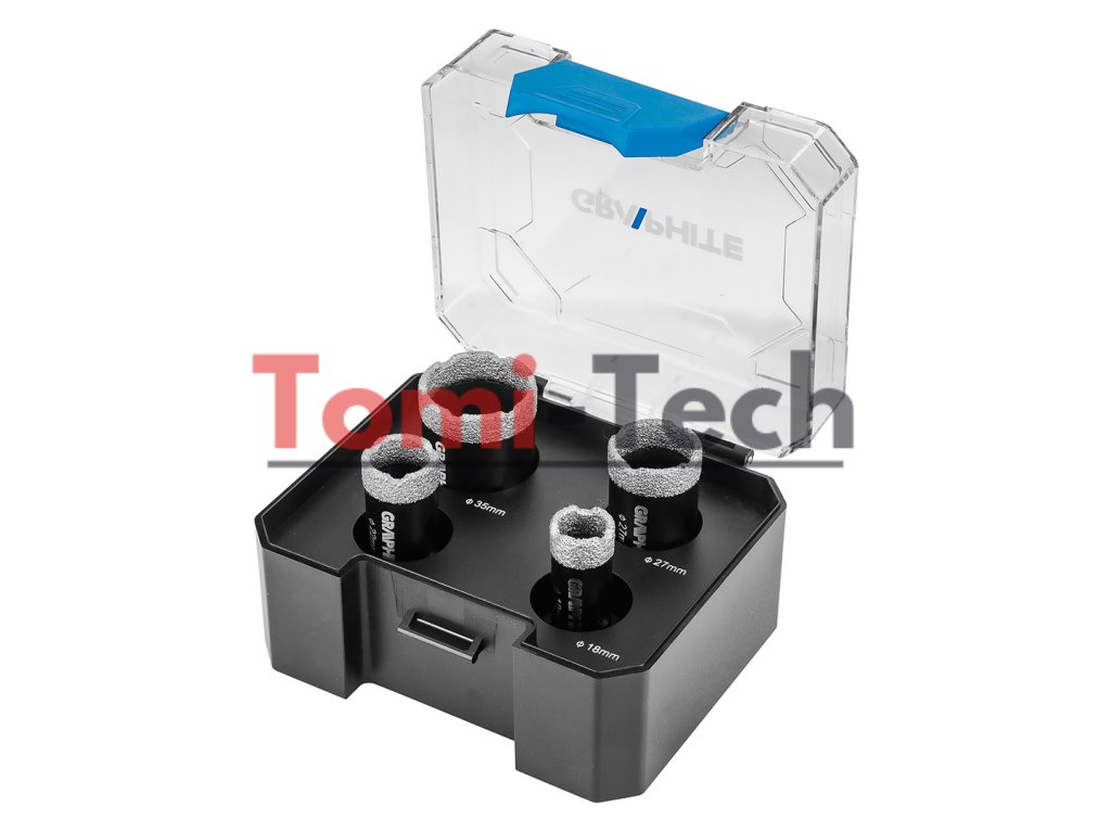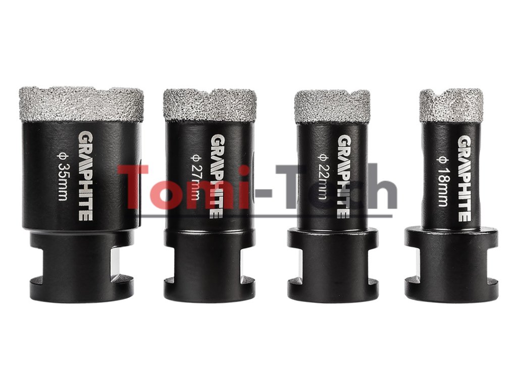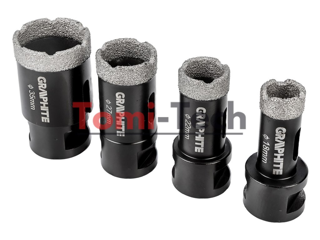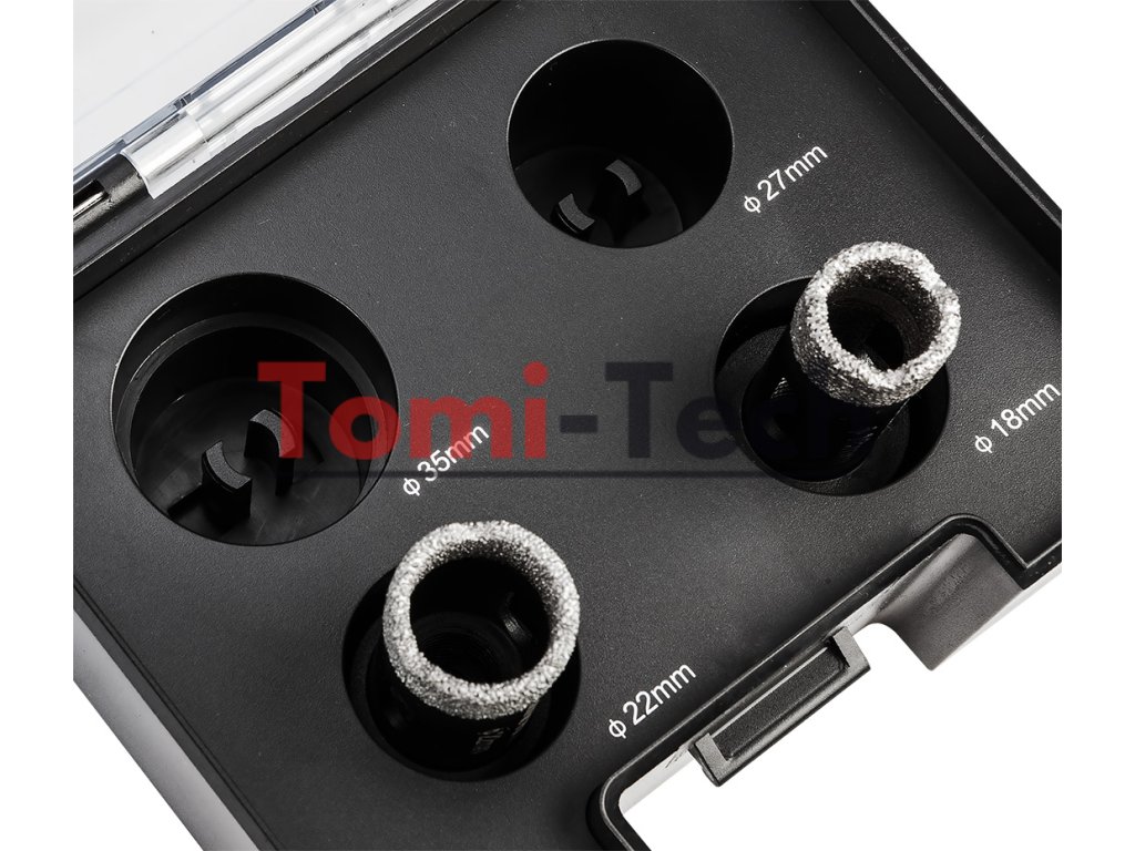 Sada diamantových dierových píl, 4 kusy. Priemery: 18, 22, 27, 35 mm. Materiál: oceľ C45; Maximálna hĺbka vŕtania: 30 mm; Maximálne otáčky: 13 000/min; skľučovadlo M14; tvrdosť HV: 175 – 200; zrnitosť: D46; výška diamantového povlaku: 10 mm. Použitie: keramika, porcelánové dlaždice, betón, slinok, kameňDodatočné parametre