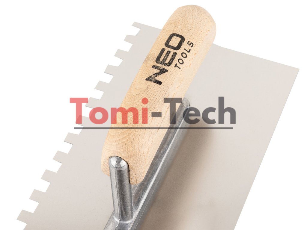 Zubová murárska lyžica 8 x 8 x 8 mm, 270 x 128 mm, vrchná časť z nehrdzavejúcej ocele s hrúbkou 0,7 mm, lakovaná drevená rukoväťDodatočné parametre