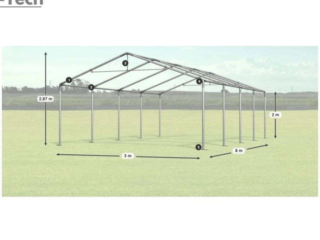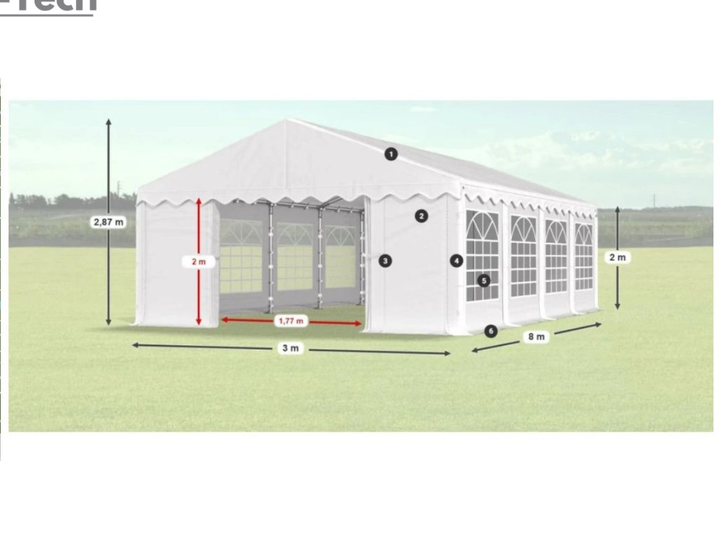 Pártystan v rozmere 3x8m s výškou 2m je výborný na rôzne akcie, alebo festivaly. Hrubá oceľová konštrukcia zabezpečuje odolnosť proti poveternostným podmienkam, stan je vyrobený z ľahkého materiálu, ktorý je veľmi odolný voči UV žiareniu, vode a plesniam. Partystan je skvelým riešením pre všetkých, ktorí chcú vytvoriť dokonalú atmosféru pre svoje párty, bez ohľadu na poveternostné podmienky. Tieto veľké stany sú navrhnuté tak, aby poskytovali dostatok priestoru pre hostí a zároveň ich chránili pred dažďom, vetrom alebo silným slnkom.