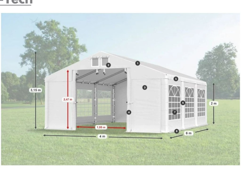 Pártystan v rozmere 4x6m s výškou 2m, opláštenie 560g/m2 je výborný na rôzne akcie, alebo festivaly. Hrubá oceľová konštrukcia zabezpečuje odolnosť proti poveternostným podmienkam, stan je vyrobený z ľahkého materiálu, ktorý je veľmi odolný voči UV žiareniu, vode a plesniam. Partystan je skvelým riešením pre všetkých, ktorí chcú vytvoriť dokonalú atmosféru pre svoje párty, bez ohľadu na poveternostné podmienky. Tieto veľké stany sú navrhnuté tak, aby poskytovali dostatok priestoru pre hostí a zároveň ich chránili pred dažďom, vetrom alebo silným slnkom.