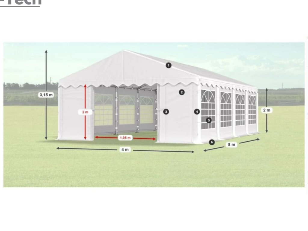 Pártystan v rozmere 4x8m s výškou 2m je výborný na rôzne akcie, alebo festivaly. Hrubá oceľová konštrukcia zabezpečuje odolnosť proti poveternostným podmienkam, stan je vyrobený z ľahkého materiálu, ktorý je veľmi odolný voči UV žiareniu, vode a plesniam. Partystan je skvelým riešením pre všetkých, ktorí chcú vytvoriť dokonalú atmosféru pre svoje párty, bez ohľadu na poveternostné podmienky. Tieto veľké stany sú navrhnuté tak, aby poskytovali dostatok priestoru pre hostí a zároveň ich chránili pred dažďom, vetrom alebo silným slnkom.