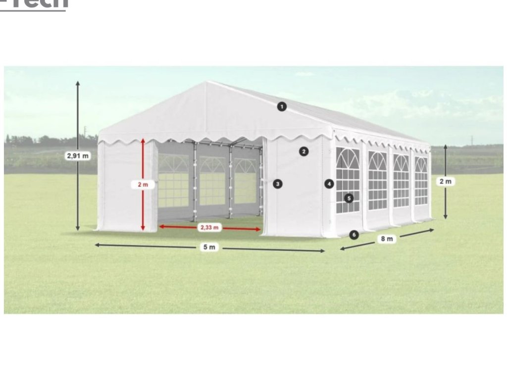 Pártystan v rozmere 5x8m s výškou 2m je výborný na rôzne akcie, alebo festivaly. Hrubá oceľová konštrukcia zabezpečuje odolnosť proti poveternostným podmienkam, stan je vyrobený z ľahkého materiálu, ktorý je veľmi odolný voči UV žiareniu, vode a plesniam. Partystan je skvelým riešením pre všetkých, ktorí chcú vytvoriť dokonalú atmosféru pre svoje párty, bez ohľadu na poveternostné podmienky. Tieto veľké stany sú navrhnuté tak, aby poskytovali dostatok priestoru pre hostí a zároveň ich chránili pred dažďom, vetrom alebo silným slnkom.