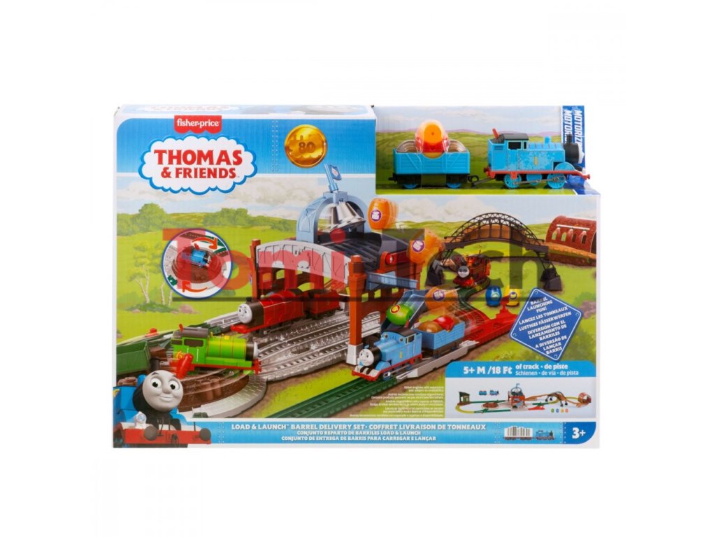 Detská vláčikodráha Thomas & Friends Load & Launch Barrel Delivery, ktorá oslavuje 80. výročie série, umožňuje predškolákom zabaviť sa s ich obľúbeným rušňom a kamarátmi. Táto veľká sada obsahuje klasický motorizovaný rušeň Thomas, vagón s odpaľovacím zariadením, 5,5 metra dlhú vláčikodráhu a príslušenstvo na postavenie sveta známeho z ostrova Sodor. Prepnite spínač na vrchu rušňa a pošlite Thomasa cez tunel a most do skladu, kde si môže vyzdvihnúť jeden zo štyroch priložených sudov. Pošlite Thomasa na cestu na stanicu, kde sa sud automaticky vysunie na strechu stanice a zazvoní! Pomocou otočného stola sa Thomas môže vrátiť do skladu, naložiť ďalší sud a opäť sa vydať na cestu. Farby a dekoratívne prvky sa môžu líšiť.