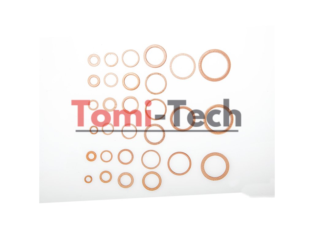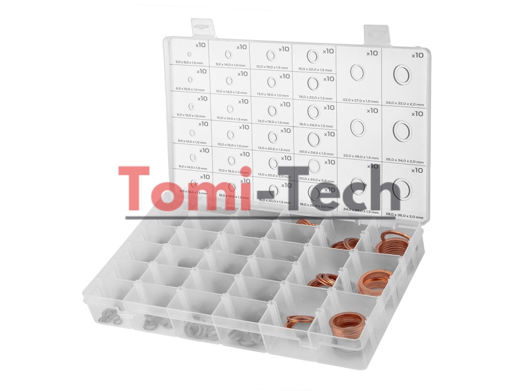 Medené podložky: 10 x (5x9x1,0 mm), 10 x (6x10x1,0 mm), 10 x (6x12x1,0 mm), 10 x (8x12x1,0 mm), 10 x (8x14x1,0 mm), 10 x (8x14x1,5 mm), 10 x (9x14x1,0 mm), 10 x (10x14x1,0 mm), 10 x (10x14x1,5 mm), 10 x (10x16x1,0 mm), 10 x (12x16x1,0 mm), 10 x (12x16x1,5 mm), 10 x (12x18x1,5 mm), 10 x (13x18x1,0 mm), 10 x (14x18x1,5 mm), 10x (14x20x1,5 mm), 10x (14x20x2,0 mm), 10x (16x20x1,5 mm), 10x (16x22x1,5 mm), 10x (18x22x1,5 mm), 10x (18x24x1,5 mm), 10x (20x24,5x1,5 mm), 10x (20x24,5x0,8 mm), 10x (19x26x2,0 mm), 10x (22x27x1,0 mm), 10x (22x29x1,5 mm), 10x (24x29x1,5 mm), 10x (24x32x2,0 mm), 10x (26x34,5x2,0 mm), 10x (28x36,5x1,5 mm)Dodatočné parametre
