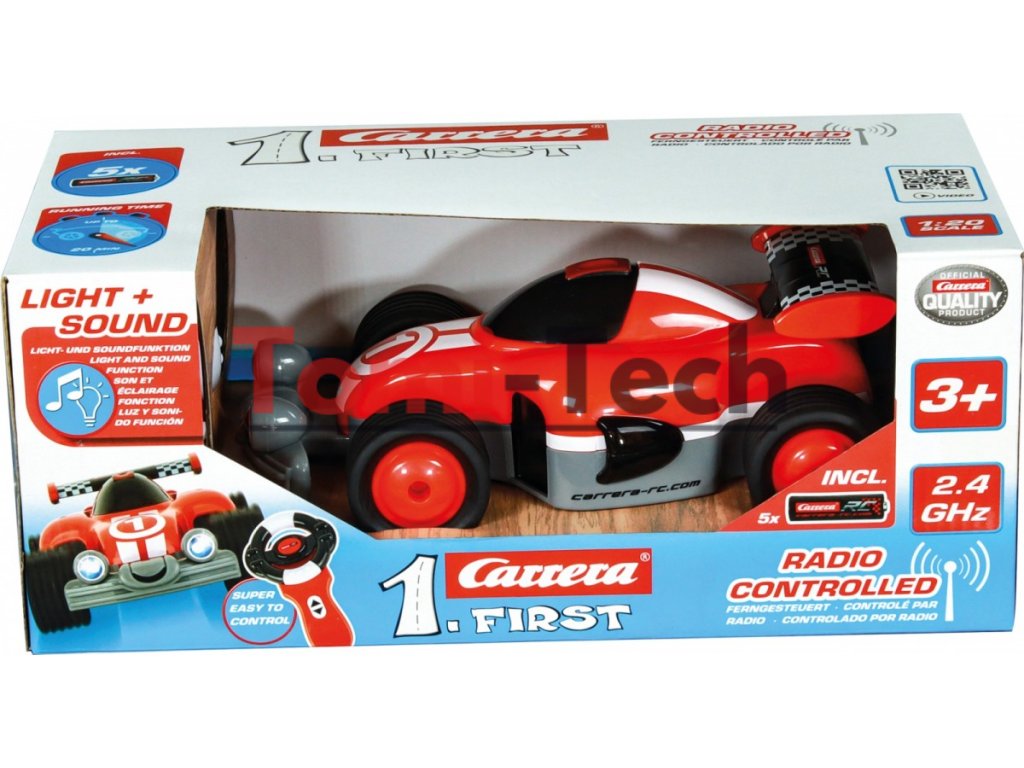S Carrera FIRST Racer sa do pretekov môžu pustiť aj tí najmenší: elegantný speedster v červeno-bielej farbe je presne prispôsobený potrebám a schopnostiam malých detí od 3 rokov. To umožňuje deťom zažiť svoje prvé pretekárske zážitky. Carrera First Racer sa bude preháňať po podlahe až 20 minút, kým bude potrebné vymeniť batérie. Zároveň malý speedster zaručuje čistú zábavu z jazdy so zvukom a svetlom. Po nabití speedstera môže akcia okamžite pokračovať! Približne 26 cm dlhé vozidlo v mierke 1:18 sa mimoriadne ľahko ovláda, čo je ideálne pre naše najmenšie. S Carrera First Racer RC je zábava zaručená!