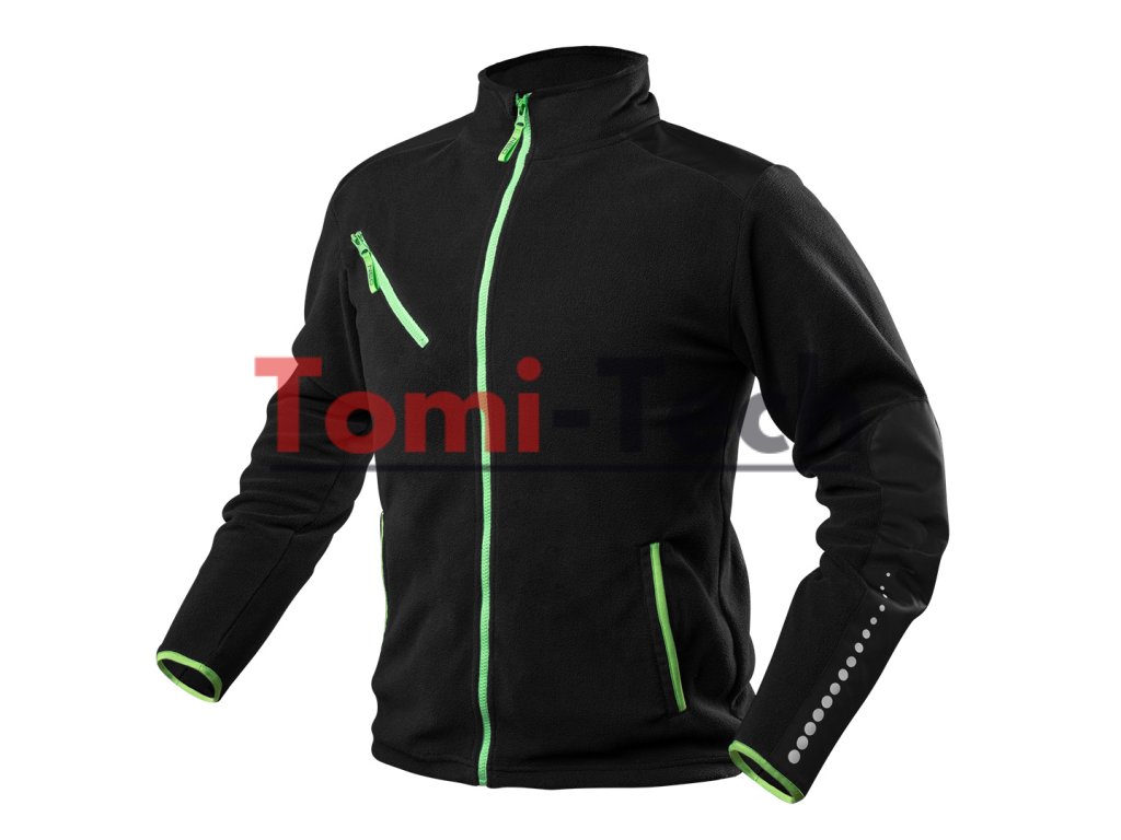 PRÉMIOVÝ pracovný flís, čierny, výstuhy z Cordury, veľkosť M, 100 % polyester, 300 g/m2, výstuhy na ramenách a rukávoch z originálnej Cordury, reflexná potlač na rukávoch a chrbte, trendy neónové zipsy a lemy rukávov a vreciek, predtvarované rukávy pre väčšie pohodlie, 3 vrecká na zips, sťahováky s reflexnou NEO potlačou, vnútorná menovka, jedinečný vlastný dizajn, certifikát CE, zhoda s normou EN ISO 13688:2013Dodatočné parametre