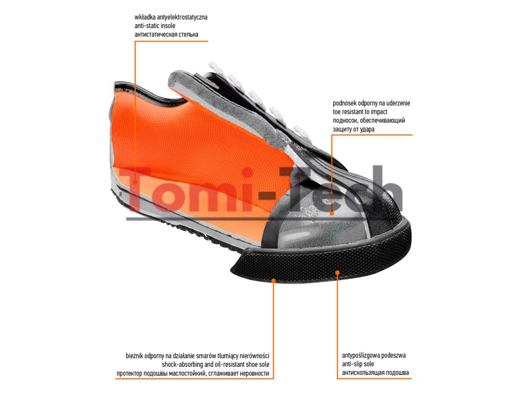 Pracovná obuv, látková, veľkosť 45, protišmyková podrážka, odolná voči oderu, olejom, benzínu a iným organickým rozpúšťadlám, oceľová špička odoláva nárazu do 200 J, pogumovaná špička, obuv vyrobená v kategórii SB FO, certifikát CEDodatočné parametre