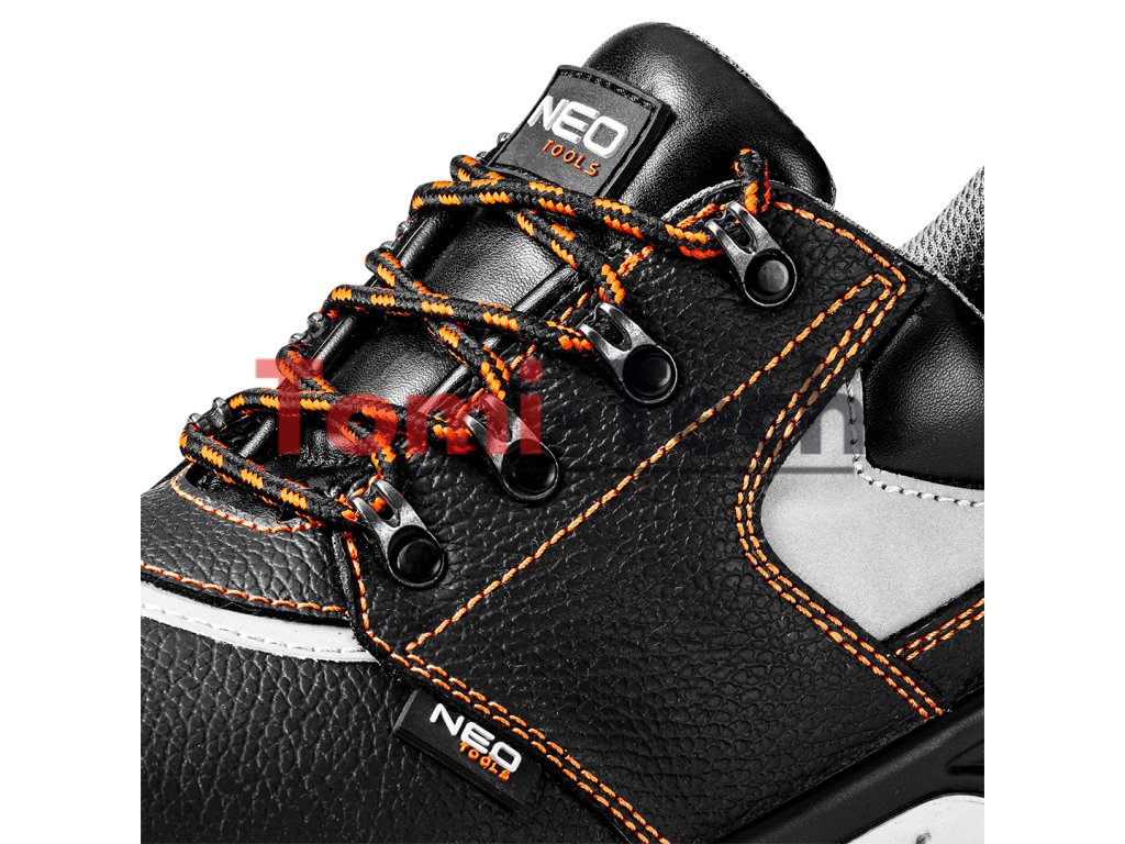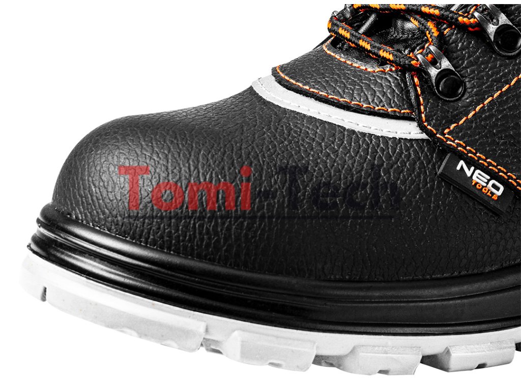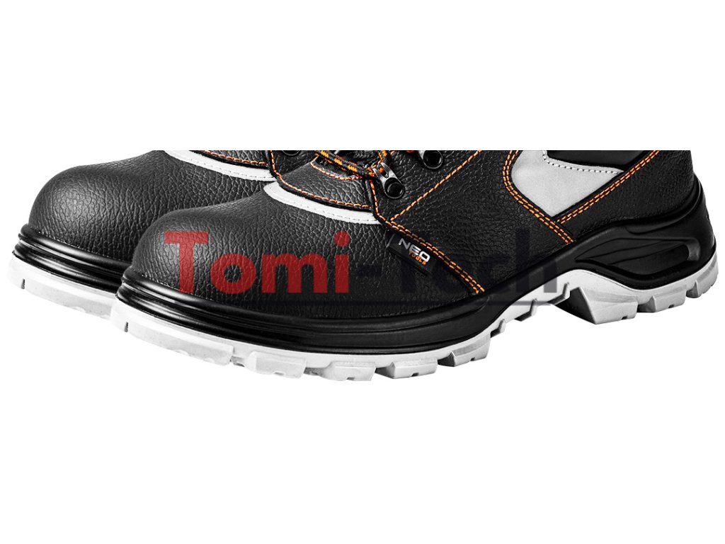 Kožená pracovná obuv, veľkosť 40, protišmyková podrážka s tlmiacim systémom, odolná voči oderu, olejom, benzínu a iným organickým rozpúšťadlám, oceľová špička odoláva nárazu do 200 J, oceľová vložka proti prepichnutiu, antistatická vložka, kovové pútka, reflexné zóny, obuv vyrobená v kategórii S1P SRA (SRA - odolnosť proti pošmyknutiu na keramických povrchoch pokrytých roztokom laurylsulfátu sodného (SLS)), certifikát CEDodatočné parametre