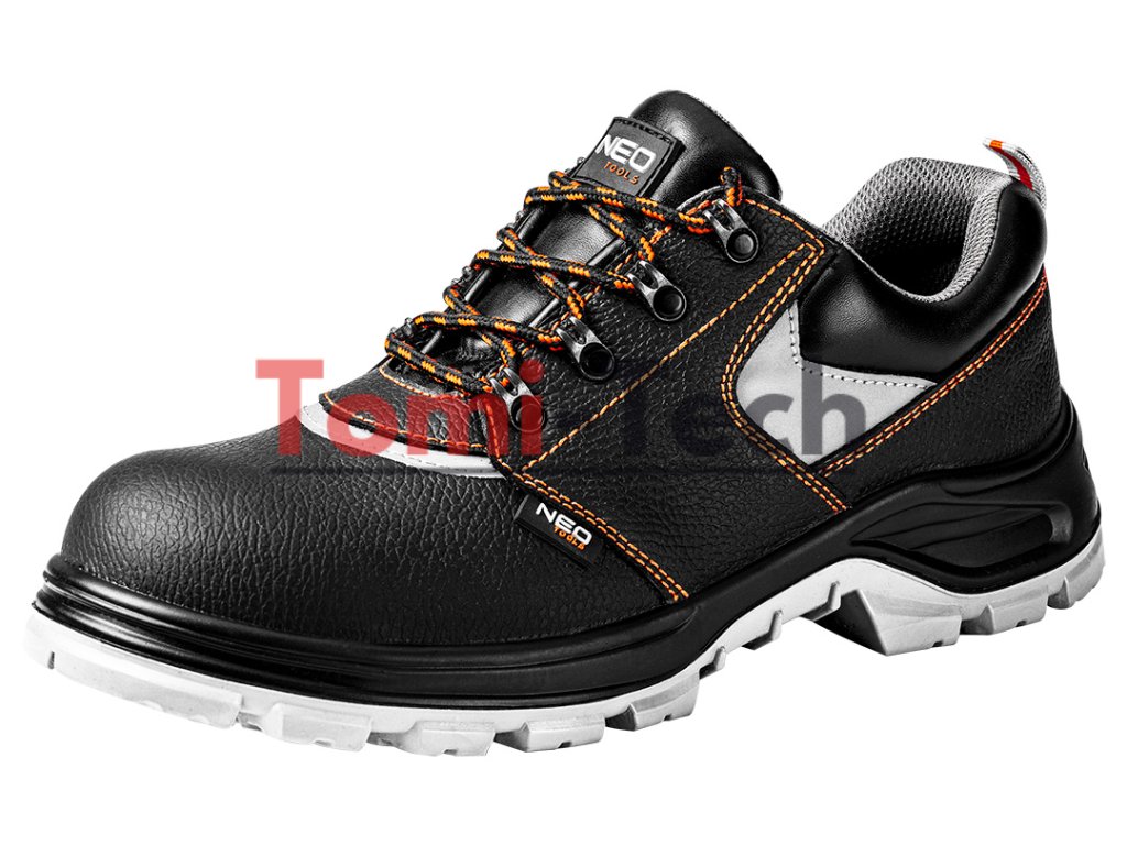 Kožená pracovná obuv, veľkosť 42, protišmyková podrážka s tlmiacim systémom, odolná voči oderu, olejom, benzínu a iným organickým rozpúšťadlám, oceľová špička odoláva nárazu do 200 J, oceľová vložka proti prepichnutiu, antistatická vložka, kovové pútka, reflexné zóny, obuv vyrobená v kategórii S1P SRA (SRA - odolnosť proti pošmyknutiu na keramických povrchoch pokrytých roztokom laurylsulfátu sodného (SLS)), certifikát CEDodatočné parametre