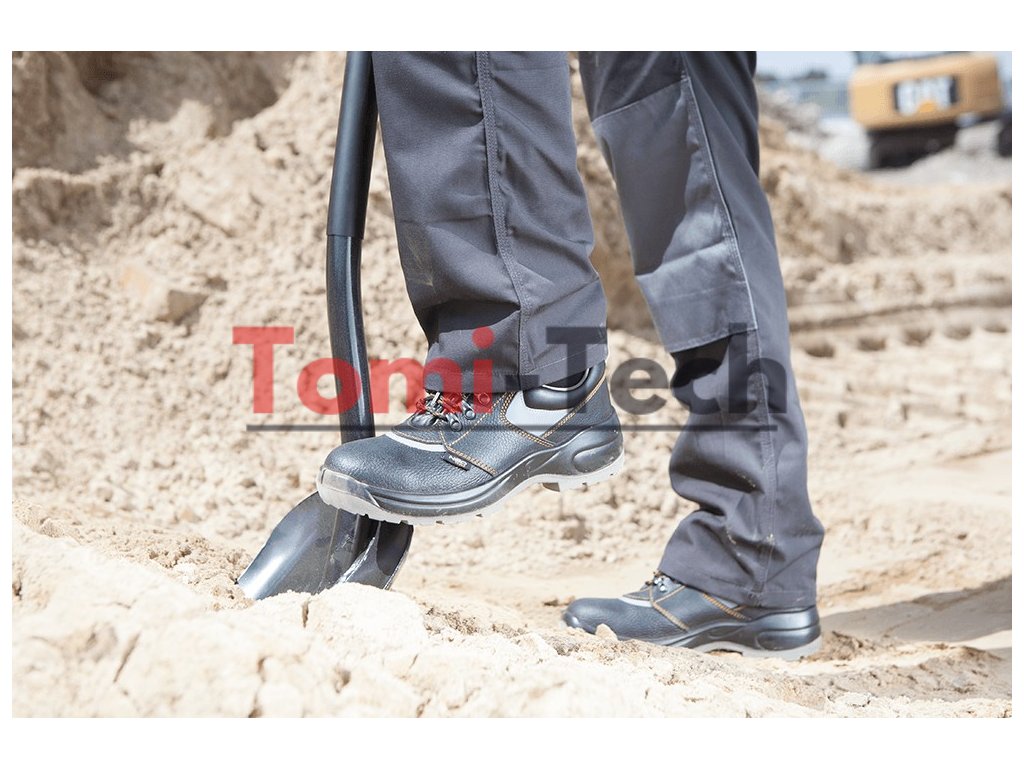 Kožená pracovná obuv, veľkosť 43, protišmyková podrážka s tlmiacim systémom, odolná voči oderu, olejom, benzínu a iným organickým rozpúšťadlám, oceľová špička odoláva nárazu do 200 J, oceľová vložka proti prepichnutiu, antistatická vložka, kovové pútka, reflexné zóny, obuv vyrobená v kategórii S1P SRA (SRA - odolnosť proti pošmyknutiu na keramických povrchoch pokrytých roztokom laurylsulfátu sodného (SLS)), certifikát CEDodatočné parametre
