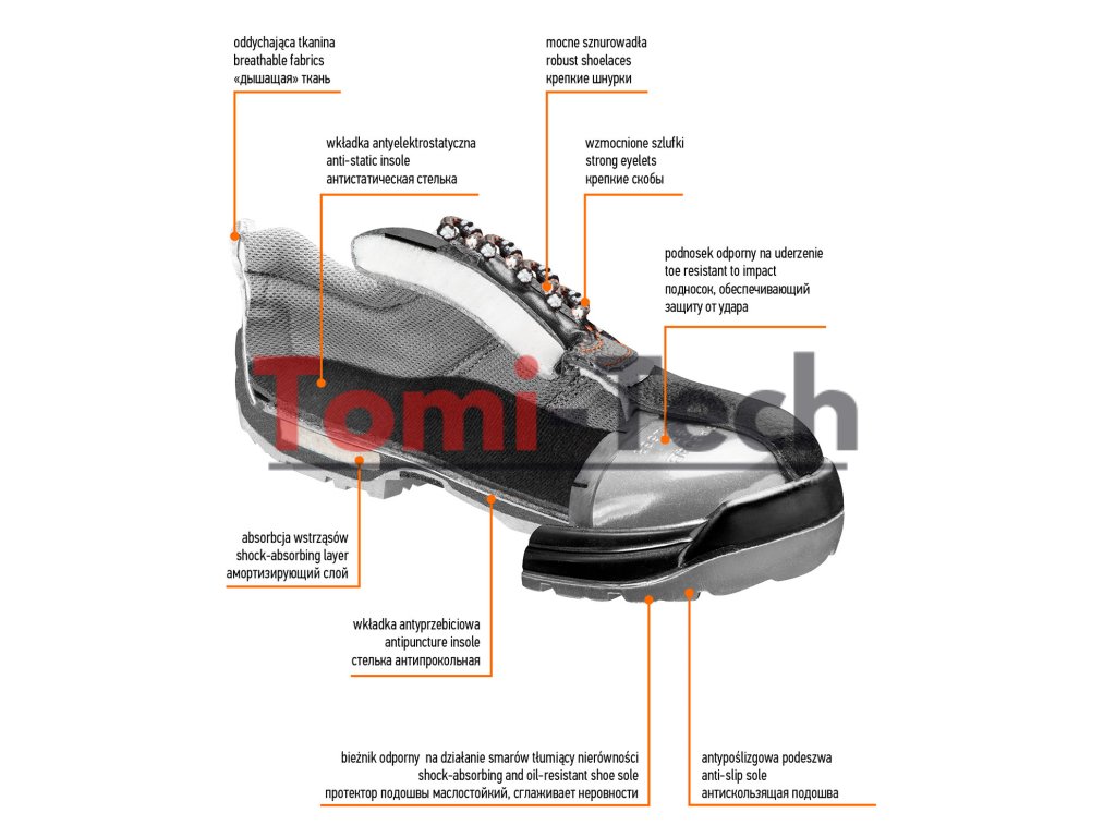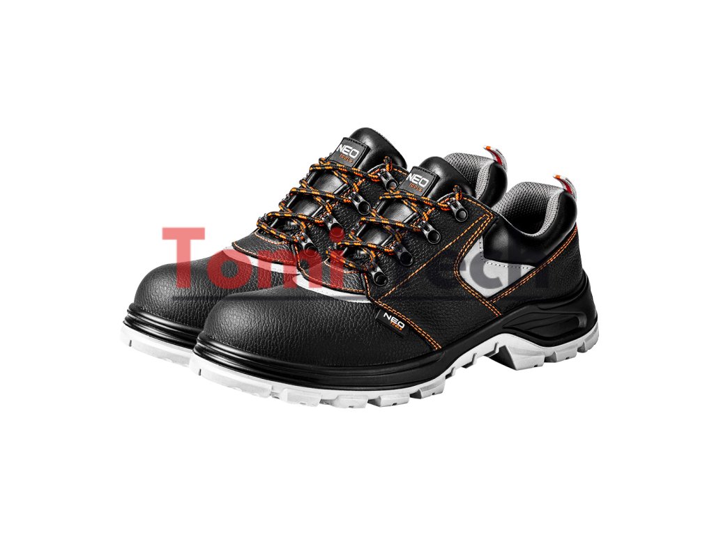 Kožená pracovná obuv, veľkosť 46, protišmyková podrážka s tlmiacim systémom, odolná voči oderu, olejom, benzínu a iným organickým rozpúšťadlám, oceľová špička odoláva nárazu do 200 J, oceľová vložka proti prepichnutiu, antistatická vložka, kovové pútka, reflexné zóny, obuv vyrobená v kategórii S1P SRA (SRA - odolnosť proti pošmyknutiu na keramických povrchoch pokrytých roztokom laurylsulfátu sodného (SLS)), certifikát CEDodatočné parametre
