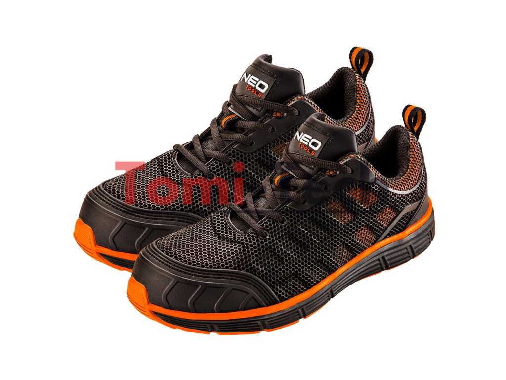 Pracovná obuv, látková, veľkosť 43, protišmyková podrážka s tlmiacim systémom, odolná voči oderu, oceľová špička odoláva nárazu do 200 J, antistatická vložka, obuv vyrobená v kategórii S1 SR FO (SR - odolnosť proti pošmyknutiu na keramickom obklade pokrytom glycerolom, FO - odolnosť podrážok voči olejom, benzínu a iným organickým rozpúšťadlám), certifikát CEDodatočné parametre