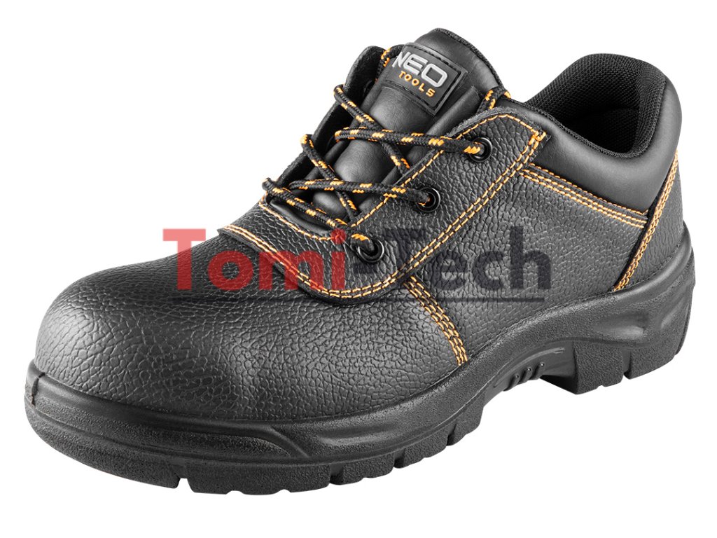 Bezpečnostná obuv, trieda S1 SR FO, zvršok z reliéfnej štiepanej kože, kovové pútka, dvojité a trojité šitie, oceľová špička poskytujúca ochranu pred nárazmi s energiou 200 J, uzavretá päta; odolnosť voči olejom, benzínu a iným organickým rozpúšťadlám; antistatické vlastnosti; absorpcia energie v oblasti päty podľa klasifikácie bezpečnostnej obuvi podľa normy EN ISO 20345, veľkosť 40Dodatočné parametre