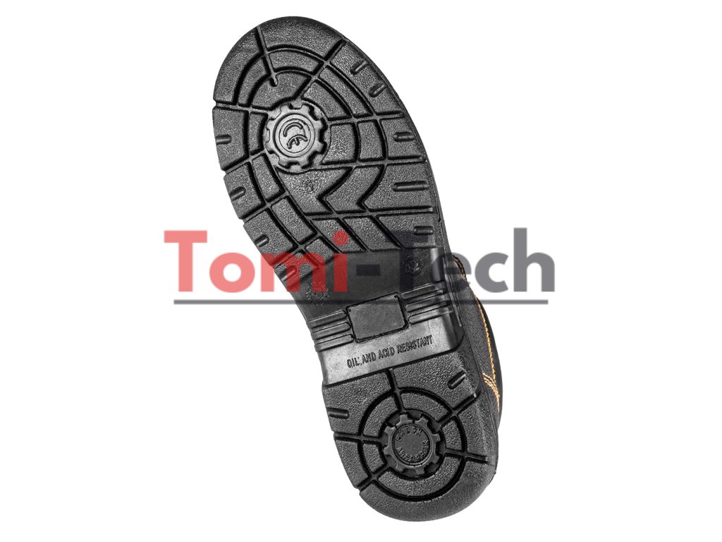 Pracovná obuv, trieda S1 SRC, zvršok z reliéfnej štiepanej kože, kovové pútka, dvojité a trojité šitie, oceľová špička poskytujúca ochranu pred nárazmi s energiou 200 J, uzavretá päta; odolnosť voči olejom, benzínu a iným organickým rozpúšťadlám; antistatické vlastnosti; absorpcia energie v oblasti päty podľa klasifikácie bezpečnostnej obuvi podľa normy EN ISO 20345, veľkosť 39Dodatočné parametre