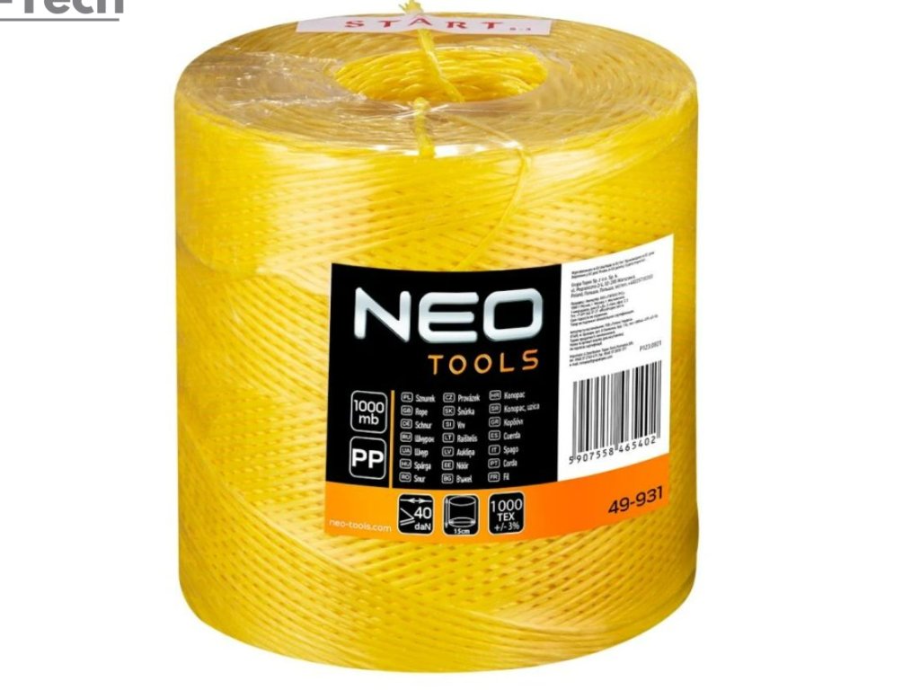 Polypropylénová šnúra 1000 m NEO (ref. 49-931) s dĺžkou 1000 m určená na upevňovanie minerálnej vlny. Šnúra je pevná, opletená a odolná proti pretrhnutiu (sila pretrhnutia nie je menšia ako 40 daN).
