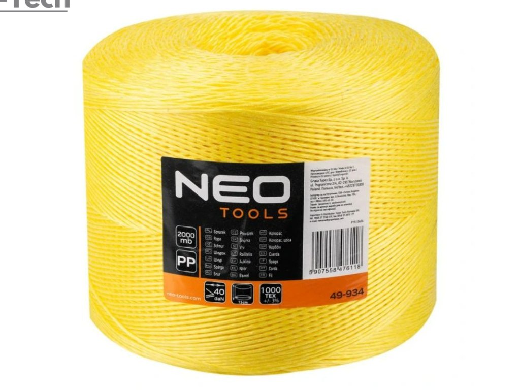 Polypropylénová šnúra 2000 m 49-934 od spoločnosti NEO TOOLS je odolná polypropylénová šnúra s dĺžkou 2000 mb v klbku. Vyznačuje sa hrúbkou vlákna tex 1000 a pevnosťou (DAN) 40, má priemer 15 cm a výšku 15 cm. Je to ľahká a pevná šnúra NEO TOOLS, určená na zavesenie minerálnej vlny, navliekanie rastlín a balenie. Možno ju použiť v poľnohospodárstve, stavebníctve a v každej domácnosti.