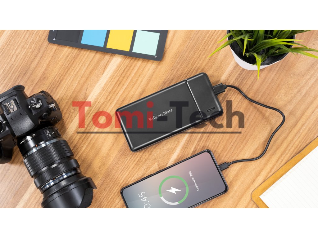 Potrebujete naozaj silnú powerbanku? Model Kruger&Matz KM0907 je vybavený lítium-polymérovým článkom s kapacitou 30 000 mAh, ktorý vám umožňuje opakovane nabiť váš smartfón, fotoaparát alebo notebook. Dôležité je, že príslušenstvo je vybavené dvoma USB portami, ktoré umožňujú nabíjať dve zariadenia súčasne. Stačí zapojiť kábel a zariadenie rozpozná pripojenie a začne pracovať.