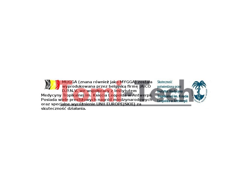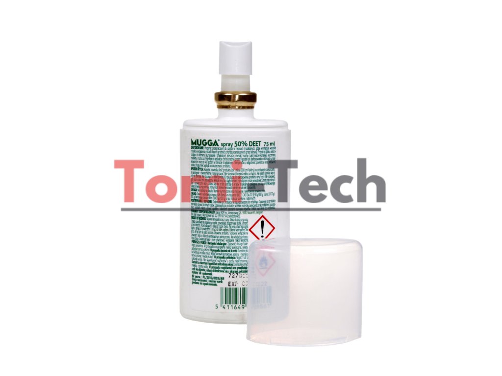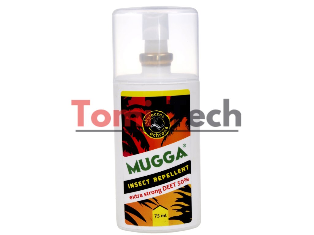 Sprej MUGGA pre dospelých a deti od 12 rokov so silným repelentným účinkom proti komárom (európskym a tropickým), muchám, krvilačným muchám, pakomárom, piesočným muchám, ovadom, ovadom, kliešťom a inému hmyzu. Chráni pred uštipnutím 6-8 hodín po aplikácii. Má príjemnú vôňu a možno ho bezpečne aplikovať na opaľovací krém a inú kozmetiku.