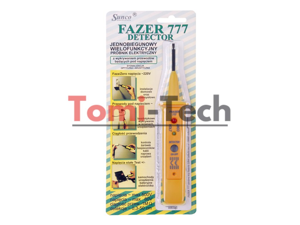 Zariadenie na detekciu elektrického napätia - detektor Fazer 777. Vynikajúci nástroj na bezkontaktnú detekciu vodičov pod napätím v rozsahu 0,3 cm až 50 cm. Dokáže detekovať striedavý fázový/nulový vodič až do maximálne 500 V, testovať kontinuitu na úrovni približne 1 MOhm a detekovať jednosmerné napätie až do maximálne 60 V. Vďaka pokročilej technológii a presnej prevádzke je tento produkt ideálny pre profesionálne elektrické aplikácie.