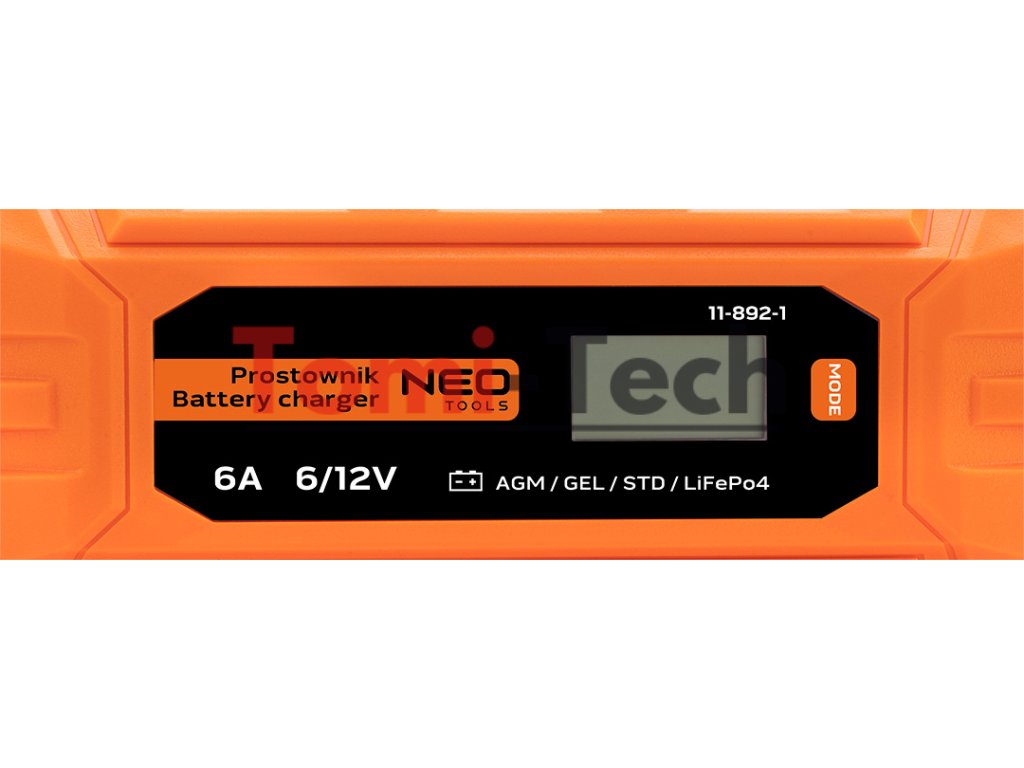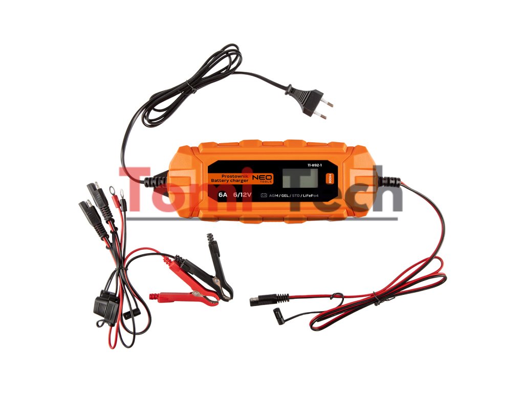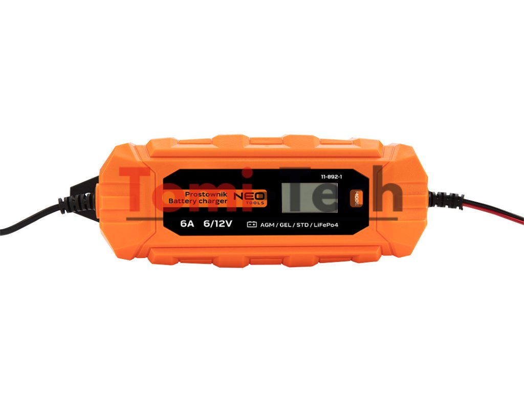 Automatická nabíjačka pre olovené akumulátory STD, AGM, GEL a LiFePO4. Dokáže nabíjať hlboko vybité batérie a regenerovať ich už od napätia 3 V. Mikroprocesorové riadenie a vstavaný LCD displej zobrazujú údaje o nabíjaní. Samostatné nastavenia režimu nabíjania. Uchováva pamäť/údaje aj počas výmeny batérie. Nabíjací prúd: 2A/6A, napätie batérie: 6V/12V, výkon: 100W, napájacie napätie: 220-240V; 50-60HZ, typ nabíjania: 10-stupňové plne automatické, dĺžka kábla: 1,5 m, kapacita batérie: 3-150Ah, trieda izolácie: IP65. Vstavaná ochrana: skrat, opačné pripojenie, prehriatie a prebitie. Funkcie: údržba, regenerácia a test batérie.Dodatočné parametre