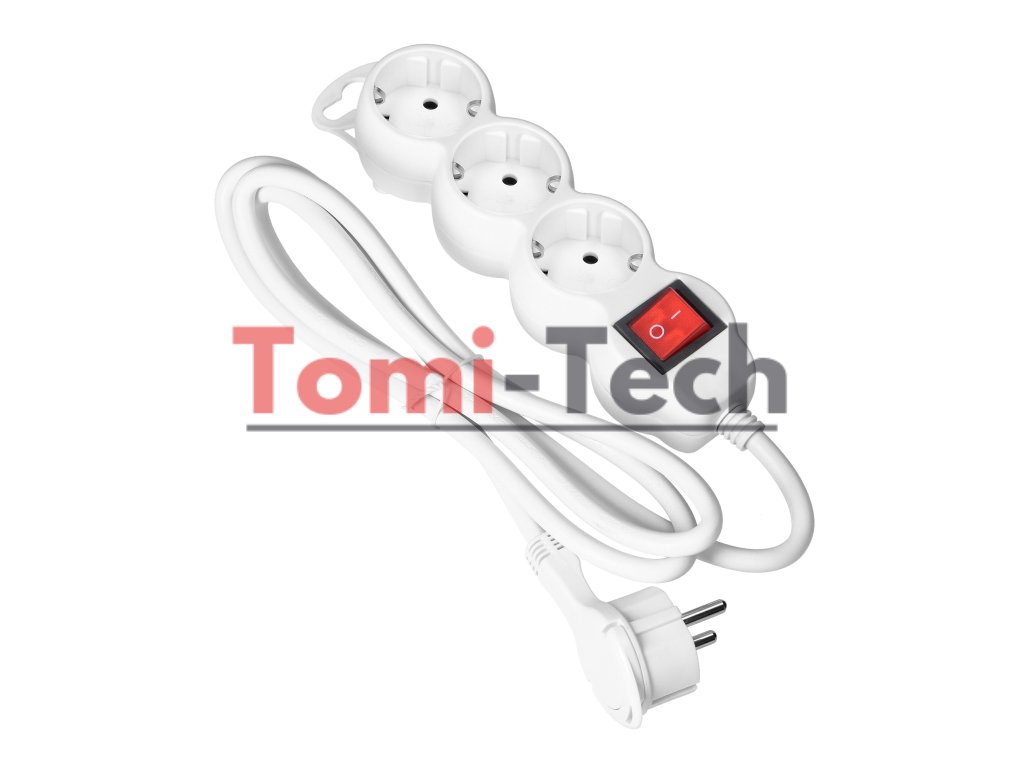 3-cestný predlžovací kábel 2P+Z (Schuko), s vypínačom, 5 m H05VV-F 3x1,5 mm2, Imax=16A, plochá zástrčka, biely