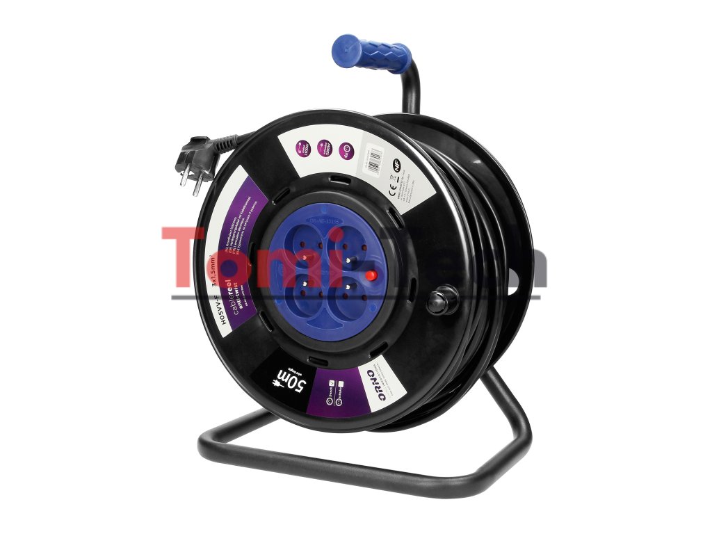 Predlžovací kábel na bubne, 4 zásuvky 2P+Z, PVC kábel H05VV-F 3x1,5 mm², dĺžka - 50 m, PEVNÉ ZÁSUVKY, tepelné relé, clony prúdovej cesty.