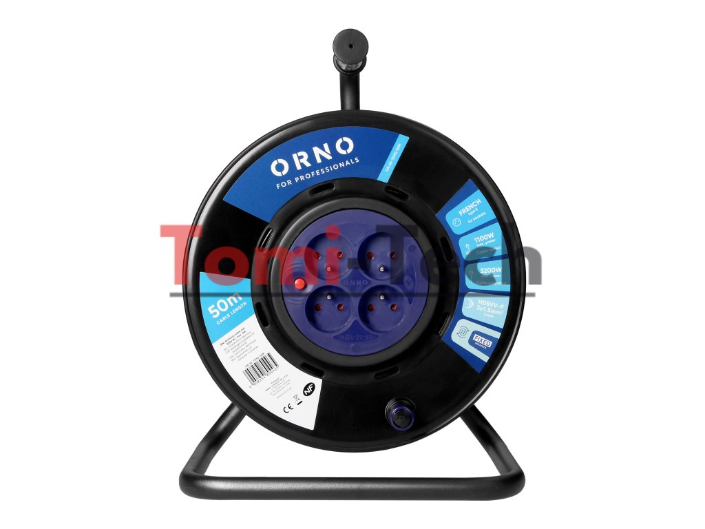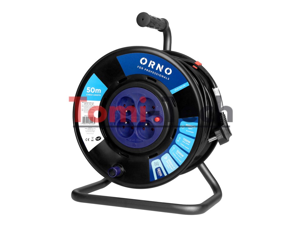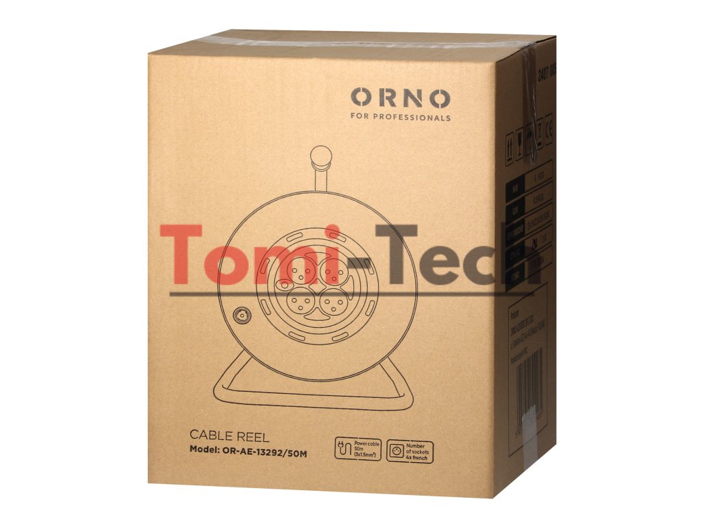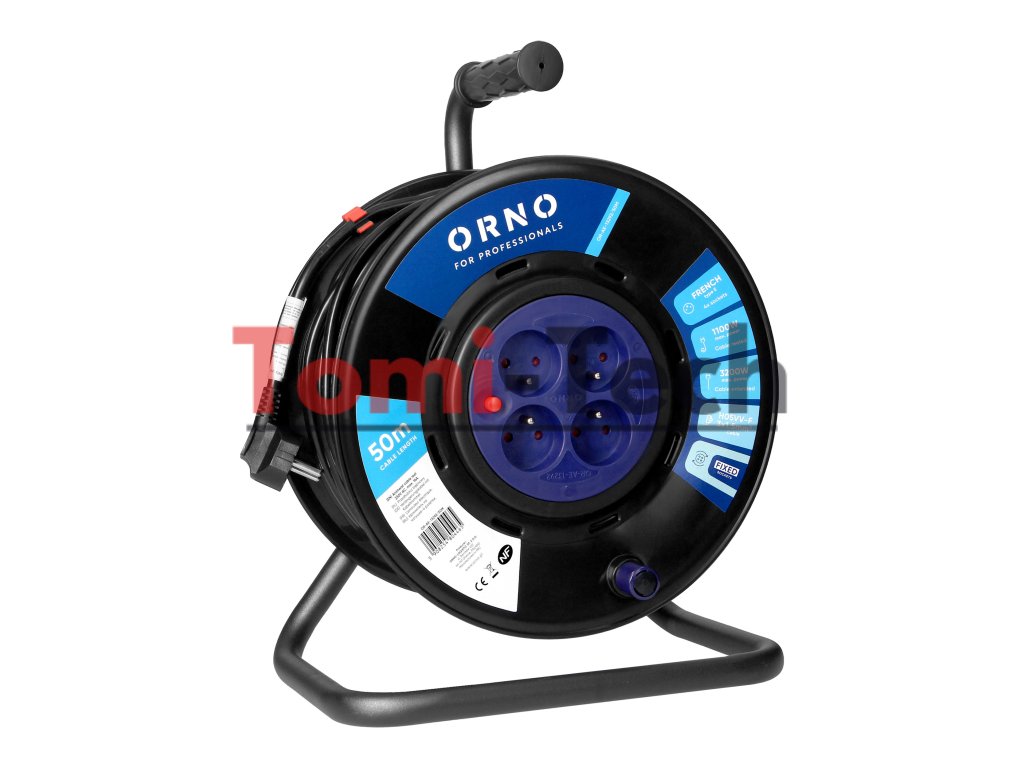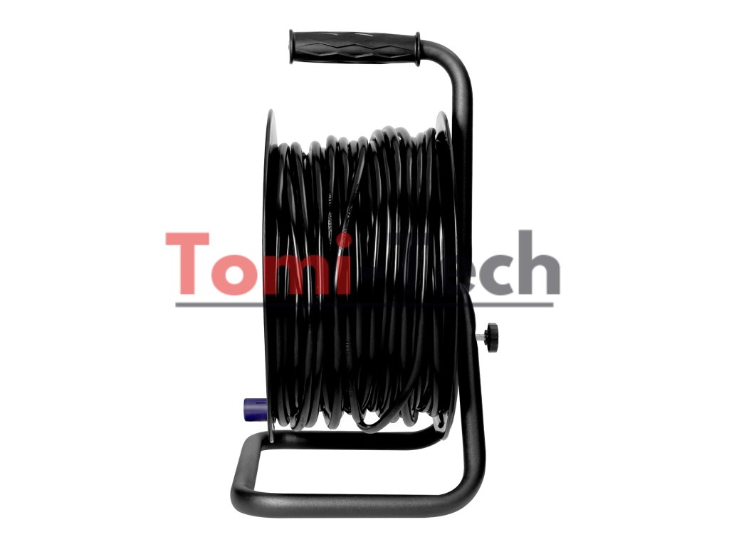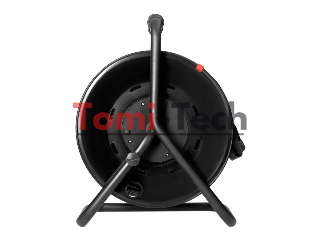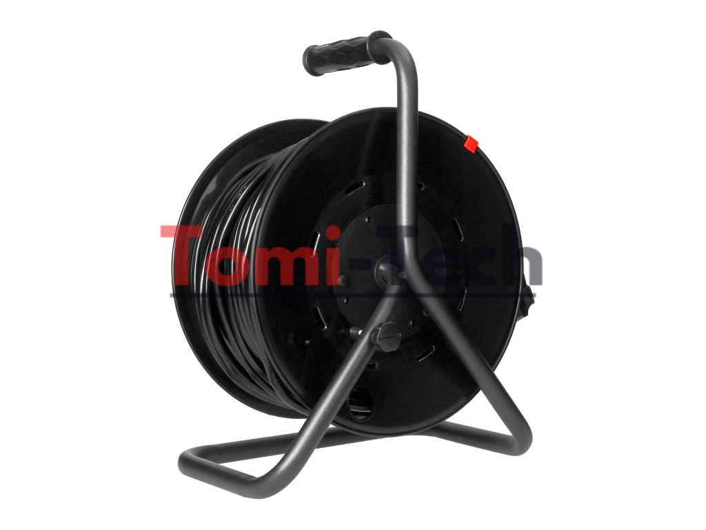 Predlžovací kábel na bubne, 4 zásuvky 2P+Z, PVC kábel H05VV-F 3x1,5 mm², dĺžka - 50 m, PEVNÉ ZÁSUVKY, tepelné relé, clony prúdovej cesty