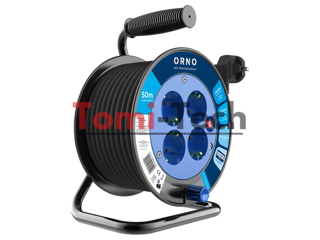 Predlžovací kábel na bubne, 4 zásuvky 2P+Z (schuko), PVC kábel H05VV-F 3x1,5 mm2, dĺžka 50 m, tepelná ochrana, clony prúdových dráh
