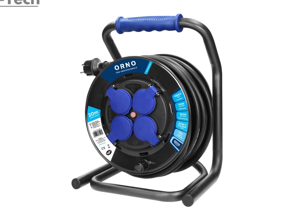 Profesionálny predlžovací kábel s krytím IP44, 4 zásuvky 2P+Z, olejuvzdorný gumový kábel, H07RN-F 3x2,5 mm², dĺžka 20 m, unikátny stojan CUBE, PEVNÉ ZÁSUVKY, tepelné relé proti preťaženiu, clony prúdovej cesty