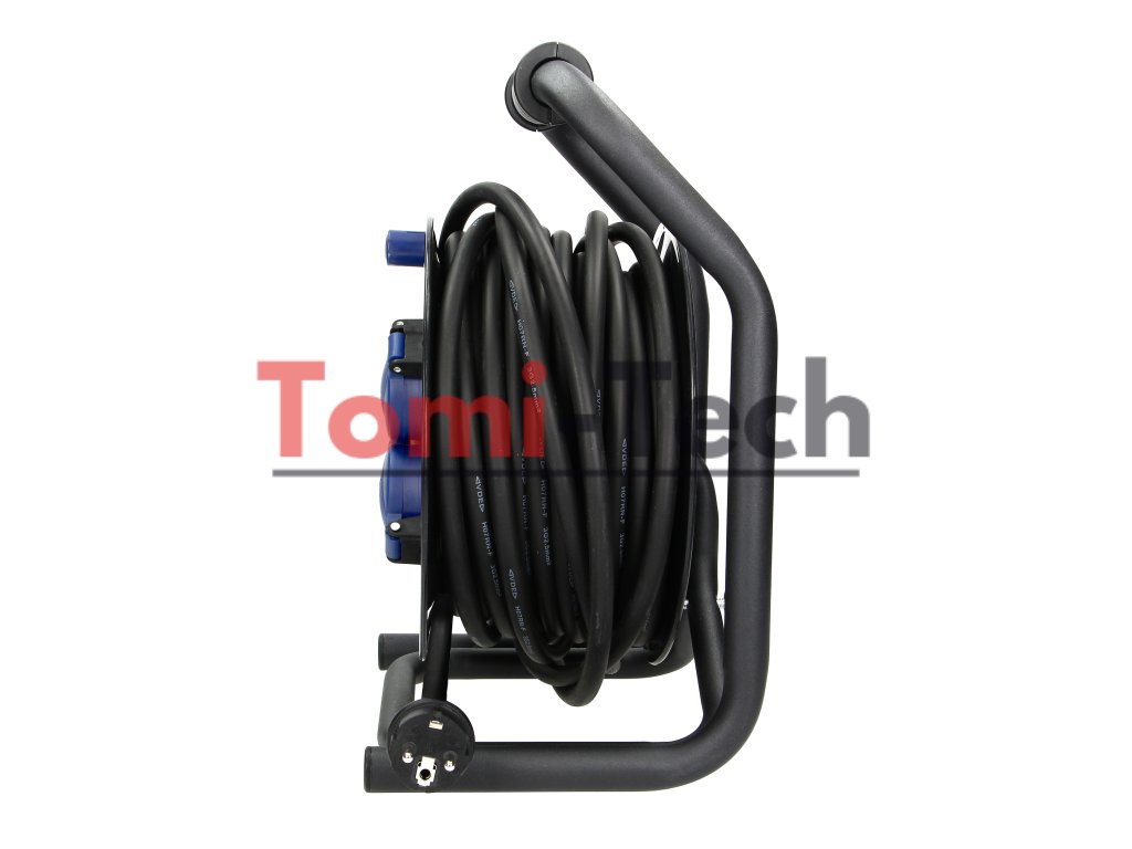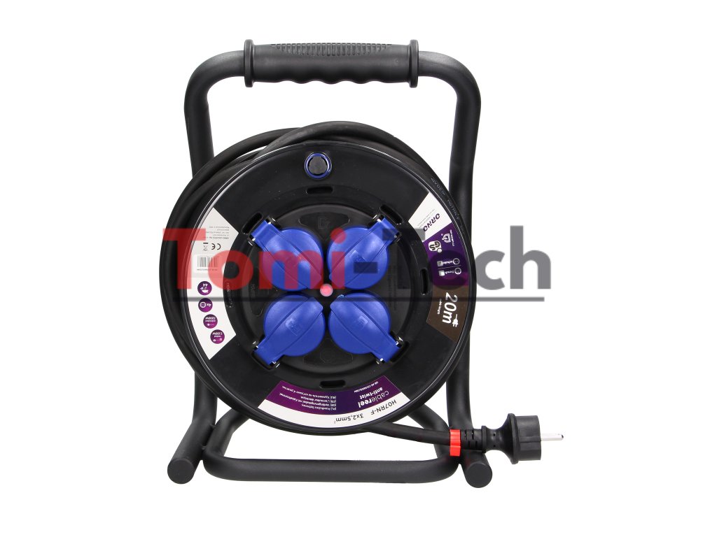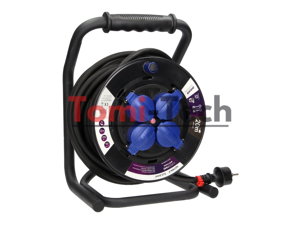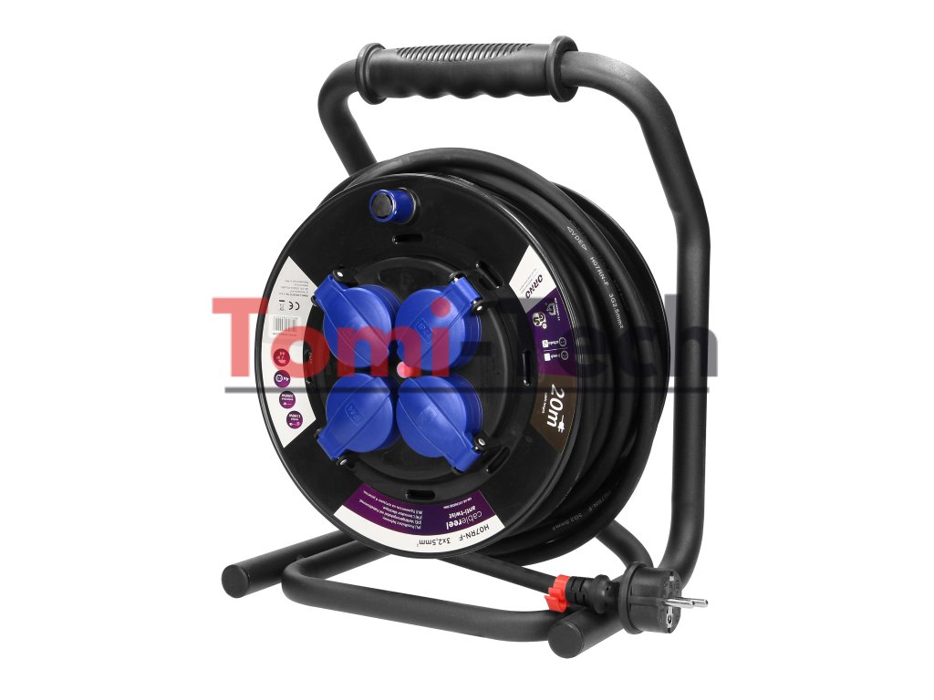 Profesionálny predlžovací kábel s krytím IP44, 4 zásuvky 2P+Z (schuko), olejuvzdorný gumový kábel, H07RN-F 3x2,5 mm2, dĺžka 20 m, unikátny stojan CUBE, PEVNÉ ZÁSUVKY, tepelná ochrana proti preťaženiu, clony prúdových dráh.