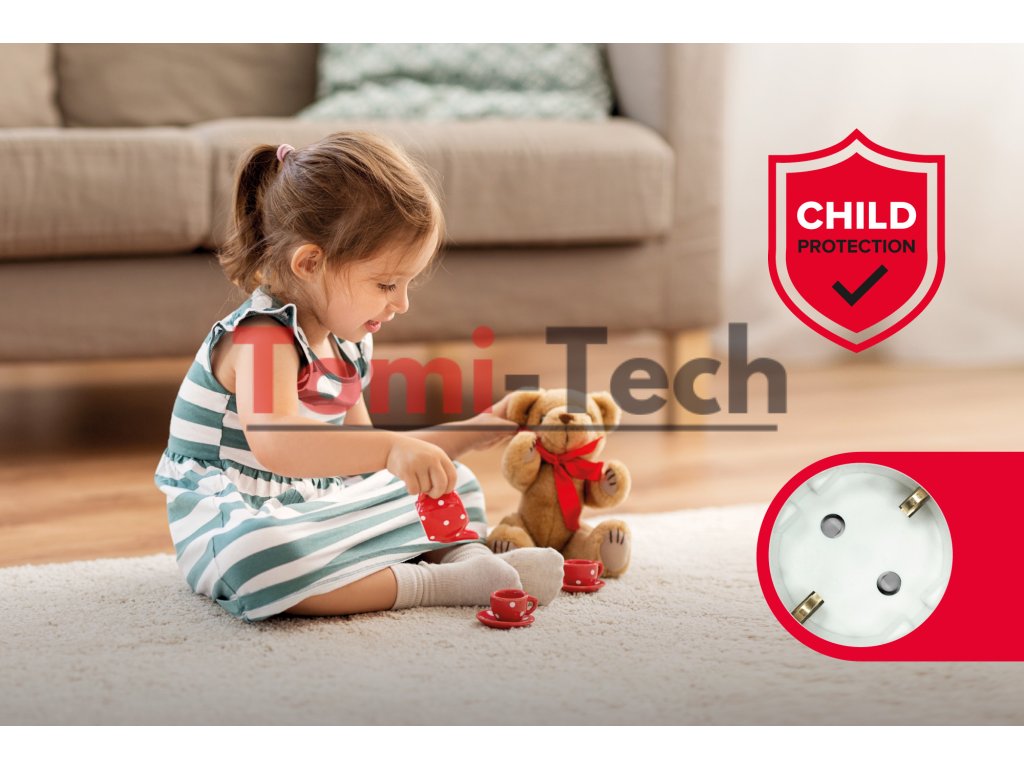 Predlžovací kábel Rebel je vybavený zabudovanými ochrannými krytmi kontaktov v zásuvkách. To účinne chráni zdravie a život detí a zabraňuje ich vkladaniu prstov alebo iných predmetov.