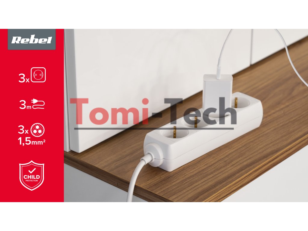 Predlžovací kábel Rebel biely, 3 nemecké zásuvky, 3 m kábel (1,5 mm)