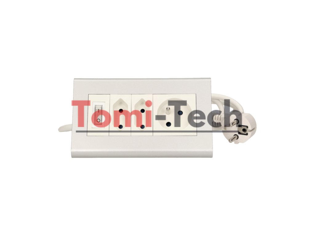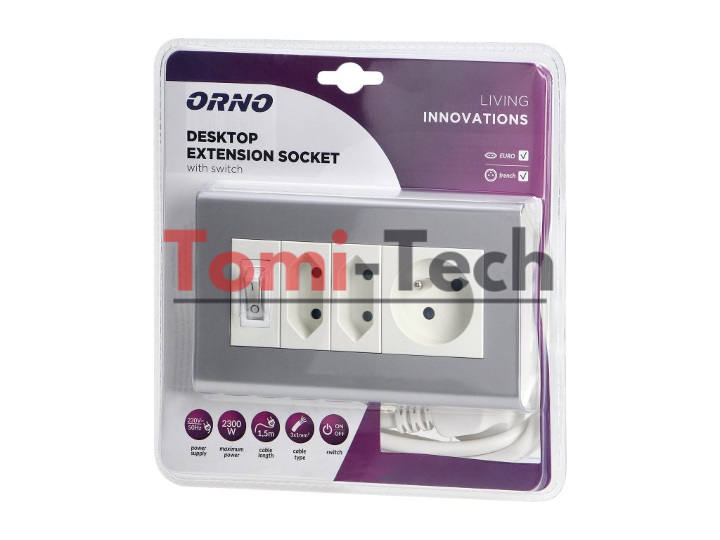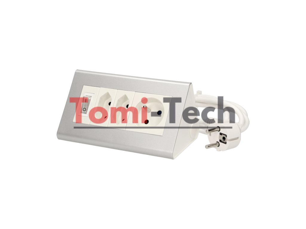 Predlžovací kábel na stôl s podsvieteným vypínačom. Zariadenie má tri sieťové zásuvky s krytkami napájania a 1,5 m kábel.Dodatočné parametre