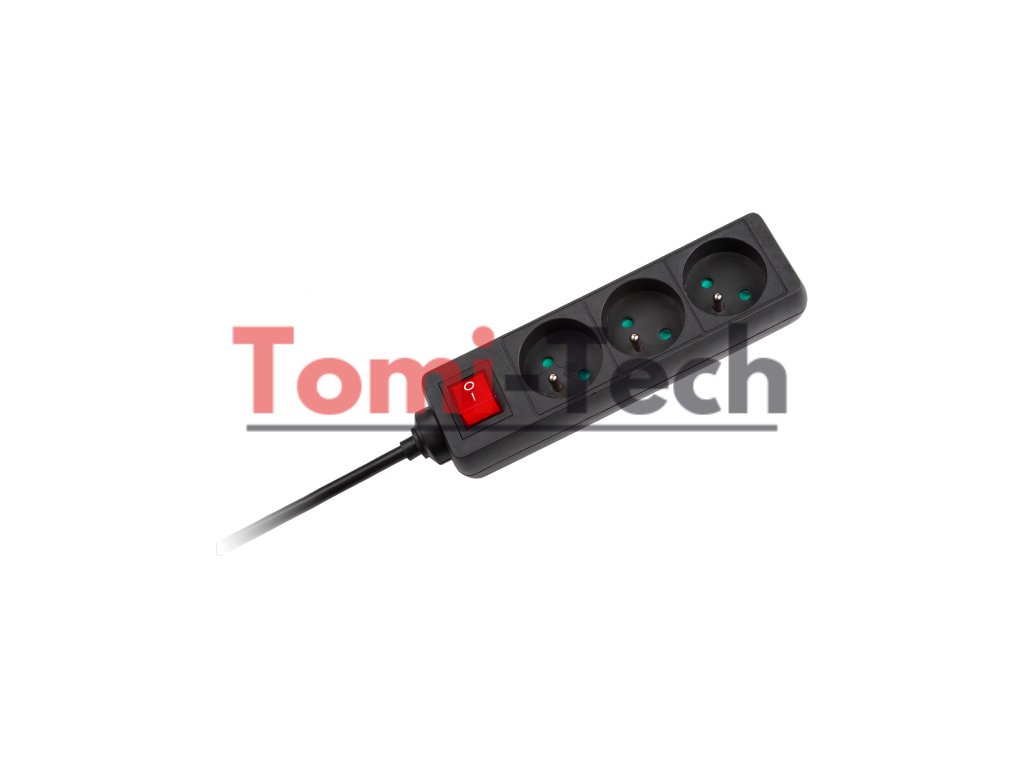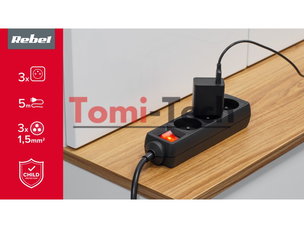 Čierny predlžovací kábel Rebel s vypínačom, 3 zásuvky - 5 m (1,5 mm)