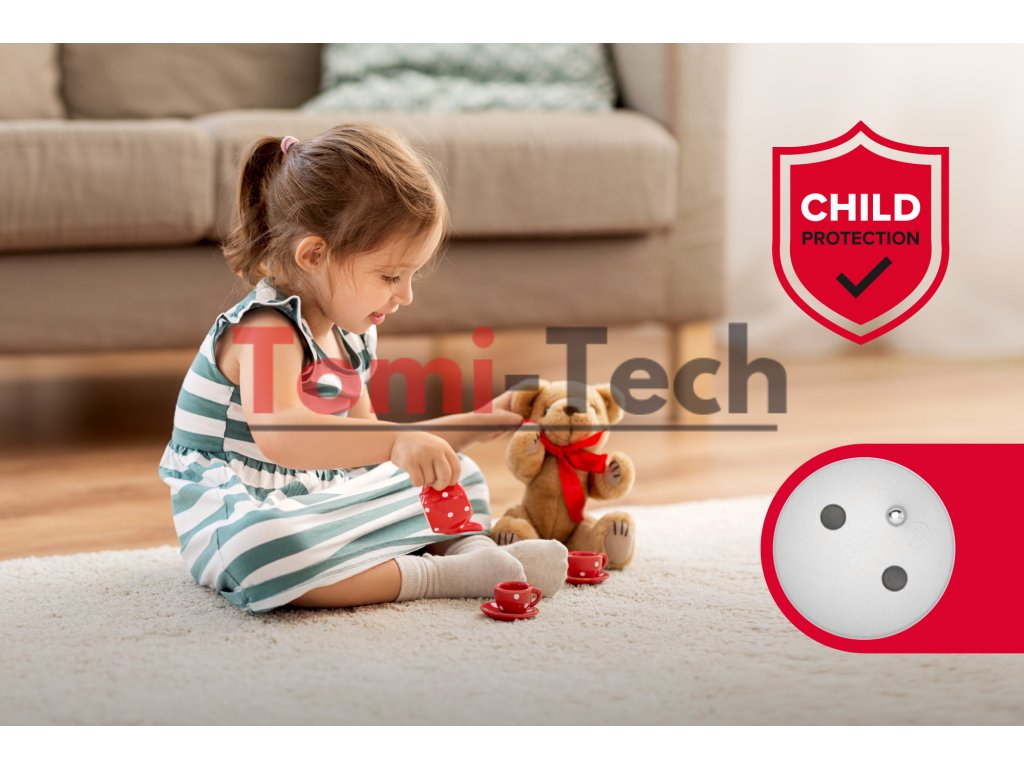 Predlžovací kábel Rebel je vybavené zabudovanými ochrannými krytmi kontaktov v elektrických zásuvkách. To účinne chráni zdravie a život detí a chráni ich pred vkladaním prstov alebo iných predmetov.