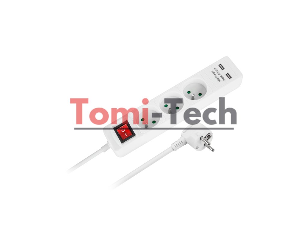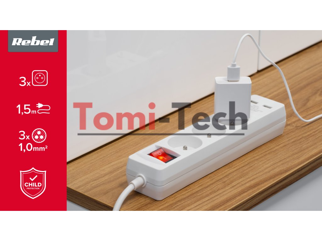 Predlžovací kábel Rebel Power s 3 zásuvkami + 2 USB zásuvkami s vypínačom - 1,5 m