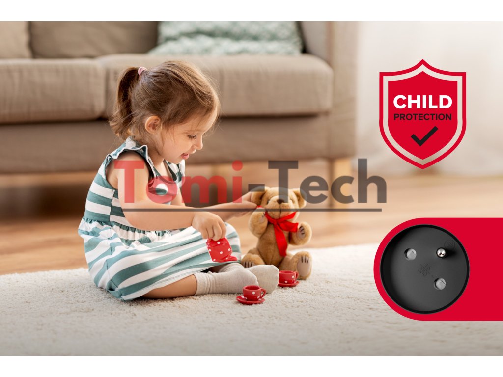 Predlžovací kábel Rebel je vybavený zabudovanými ochrannými krytmi kontaktov v zásuvkách. Toto účinne chráni zdravie a život detí tým, že ich chráni pred vkladaním prstov alebo iných predmetov.