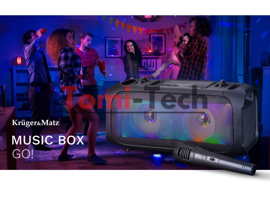 Ak vás zaujíma, ktorý reproduktor je najlepší na párty, práve ste našli odpoveď! Bluetooth reproduktor Kruger&Matz je vybavený dvoma meničmi s výkonom 4,8 W a zaručuje vynikajúcu kvalitu vašich obľúbených skladieb a mikrofónový vstup zabezpečí veľa radostných chvíľ počas karaoke. Za zmienku stojí aj rozmanitosť médií, ktoré môžete použiť na prehrávanie hudby na Music Box Go!. reproduktor.